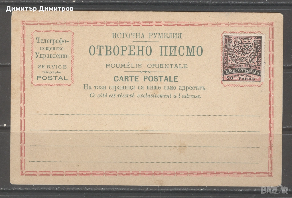 Пощ.карта- Източна Румелия с марка от 20 пара,чиста → Обява 53564899