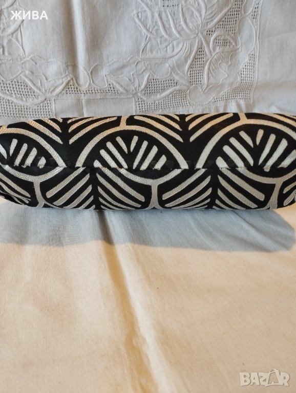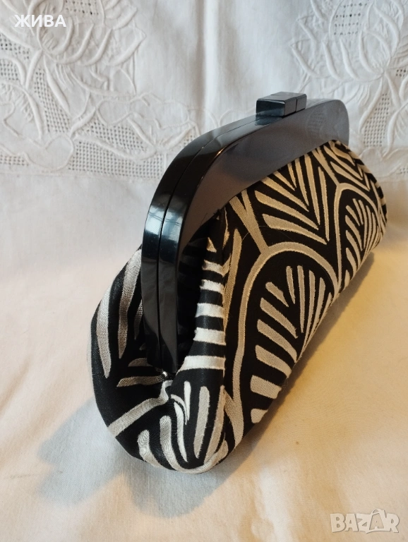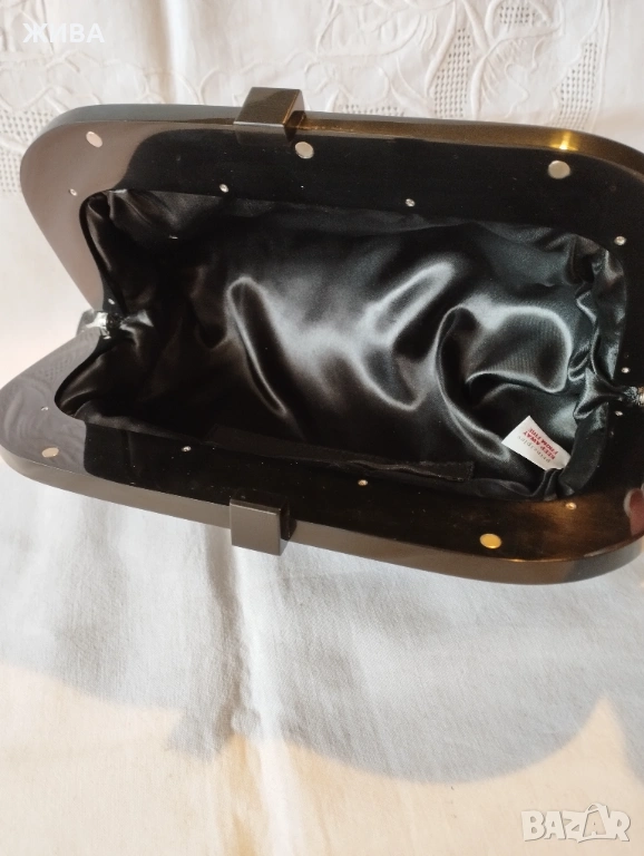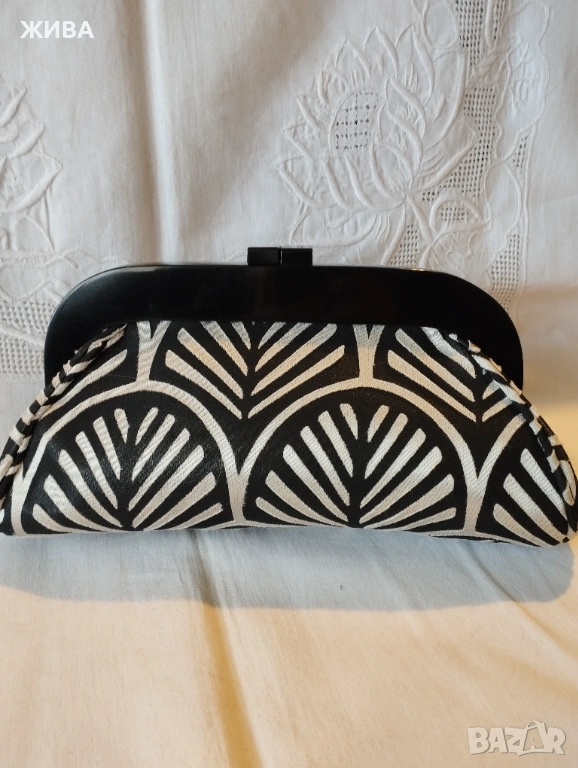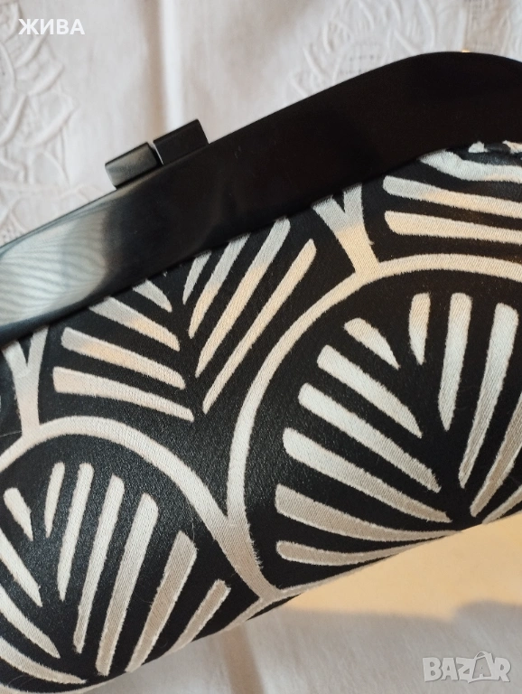 ЕСТЕСТВЕНА КОПРИНА дамски клъч в черно и сиво металик, едно вътрешно отделение и един вътрешен джоб, отваря се с приплъзване на двете страни, много ефектен, подплата от черен сатен.