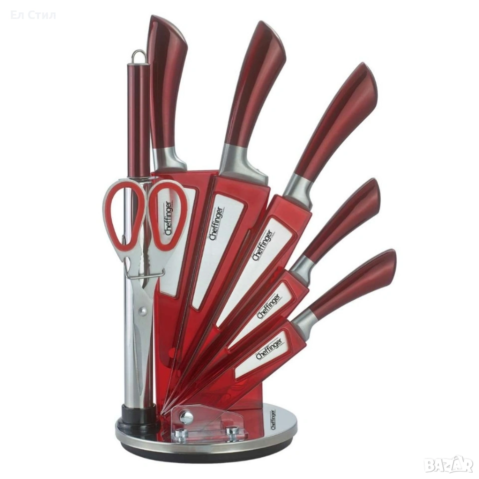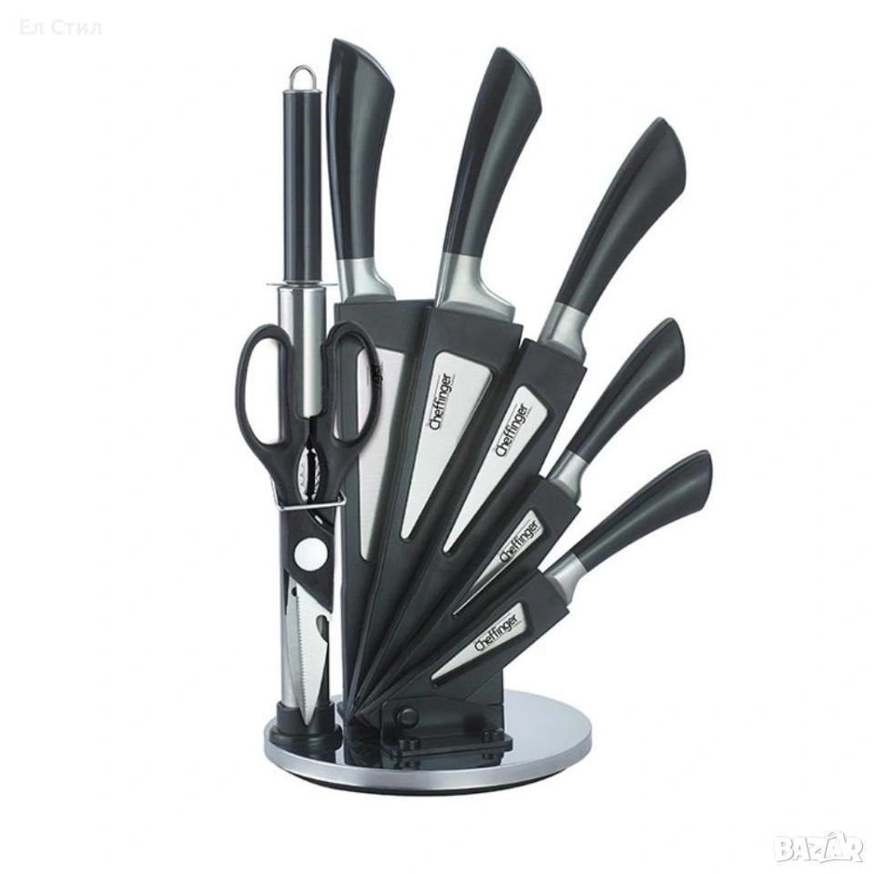 Комплект ножове 8 части със стойка Cheffinger – неръждаема стомана, въртяща се акрилна поставка 360°