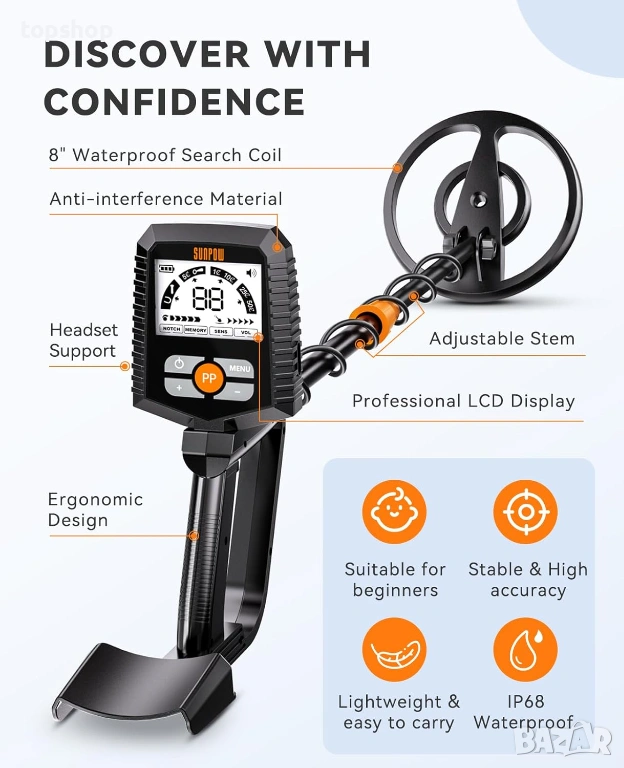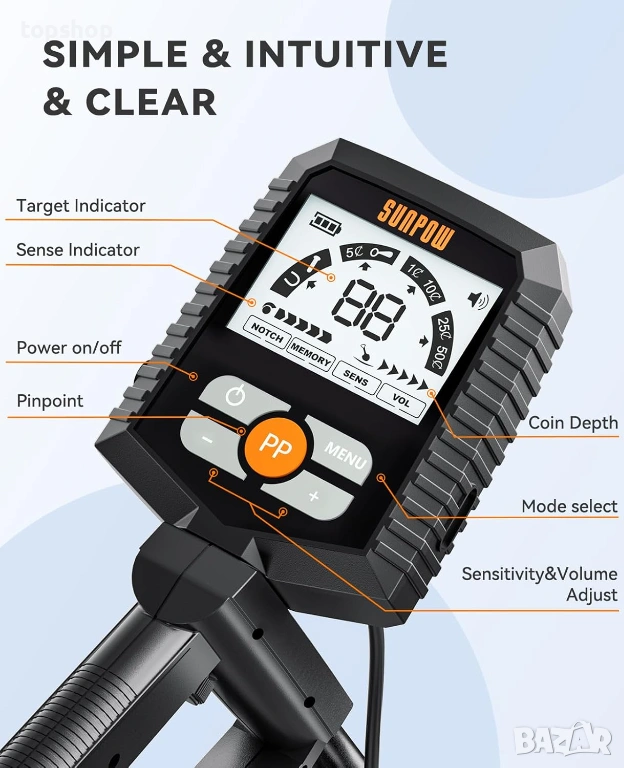 Продавам професионален металотърсач SUNPOW, проектиран за висока точност и стабилност при работа. Уредът е идеален за търсене на злато, монети и реликви, като предлага отлична защита от външни смущения.