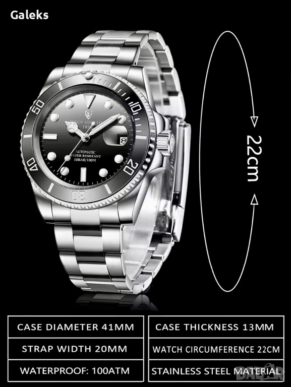 С външен размер (на каса) от 41мм. и каишка - 22см. от неръждаема стомана с тъмен циферблат.