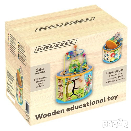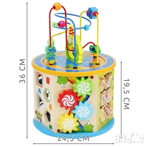 Този дървен образователен куб 8в1 предлага часове забавление, съчетани с учене и развитие. Кубът разполага с няколко цветни функционални страни с различни активности, както и с допълнителни игри отгоре и отдолу, които развиват логикическото мислене, фината моторика и координацията око–ръка. Ярките цветове стимулират въображението, а разнообразните задачи помагат на детето да учи числа, цветове, форми, време и основни математически умения чрез игра. Изработен е от гладко шлифовано дърво и боядисан с безопасни бои, което го прави подходящ и безопасен за малки деца.