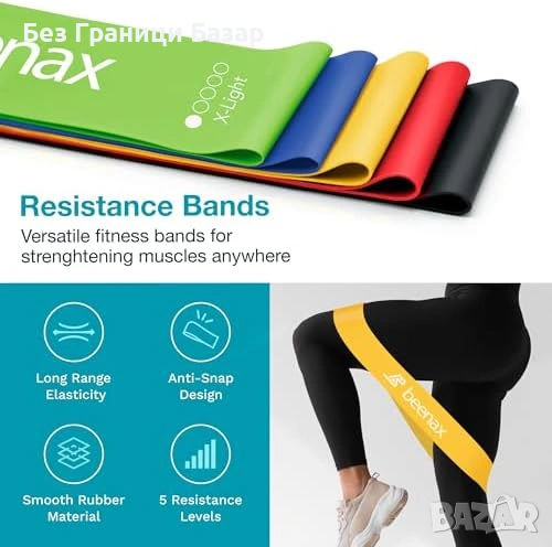 Включва латексови ластици с 5 нива на съпротивление – от много леко до много тежко