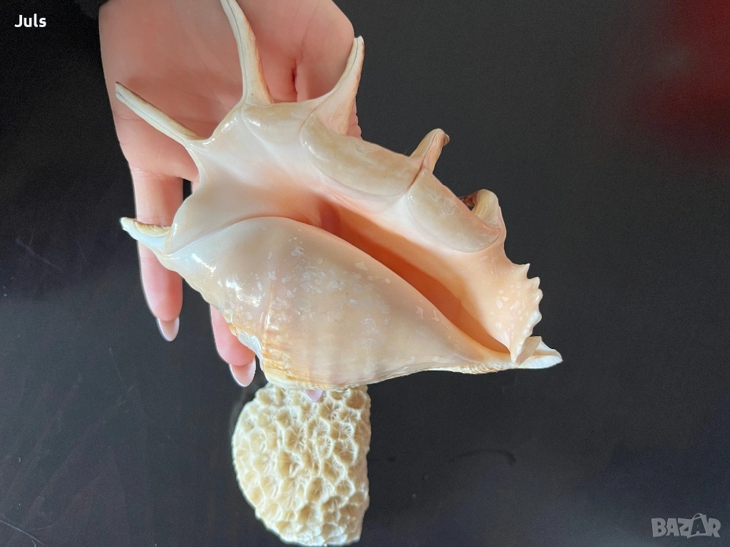 Предлагам красива голяма морска раковина тип Spider Conch с изразени естествени шипове и топъл кремаво-прасковен нюанс. Раковината е масивна, с естествен блясък и отлично състояние – без видими счупвания.