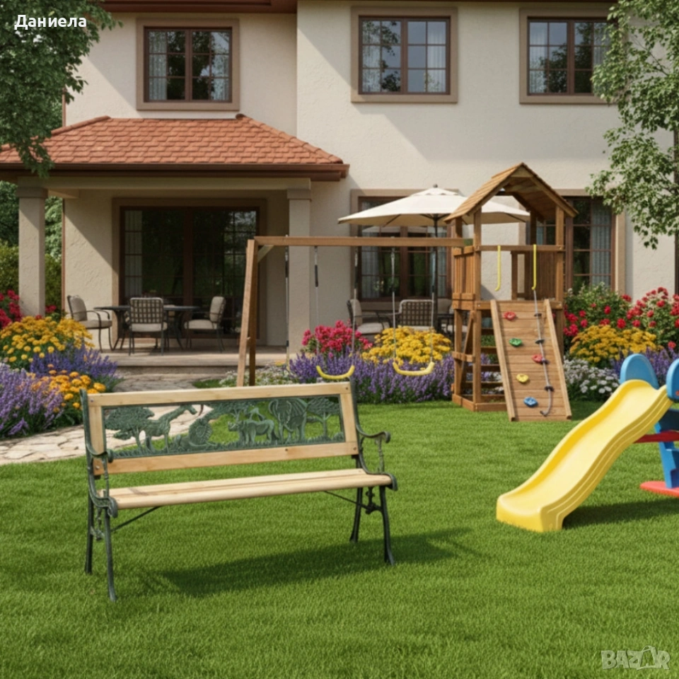 Градинска пейка за деца Техническите параметри гарантират качество и надеждност при ежедневна употреба: Дължина: 82 см Дълбочина: 39 см Височина: 50 см Материал: чугунен скелет + дървени ламели Цвят: естествено дърво / зелен декоративен чугун Конструкция: масивна, с болтове и подсилващи елементи Максимална товароносимост: 50 кг Поддръжка: препоръчва се периодично третиране на дървото и почистване на металните части