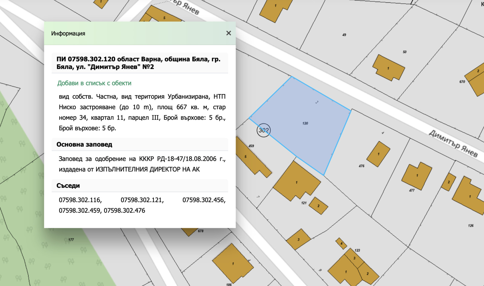 - Идентификатор: 07598.302.120 актуална кадастрална скица (2018 г., без последващи промени)