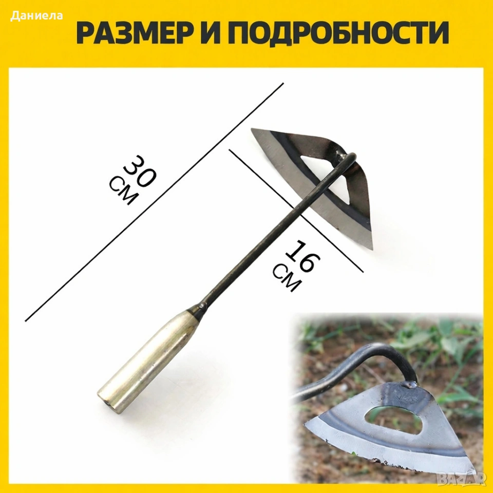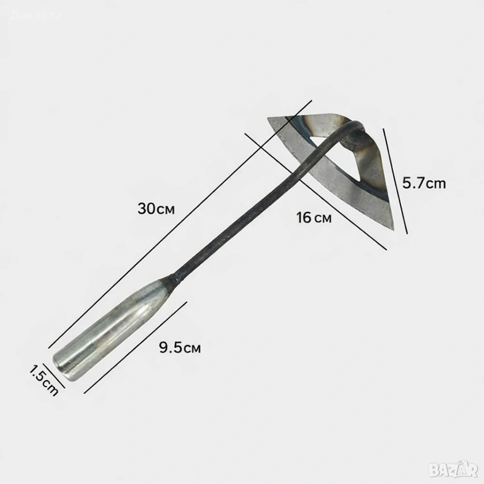 Технически характеристики Закалена стомана 45#, 4 мм острие — дълготрайна рязкост Пълна ръчна заварка — здрава конструкция за упорита работа Куха дръжка (9.5 см), обща дължина 30 см — може да се удължи с прът Острие - 16 см — бързо плевене, прокопаване и браздене Разбива твърди буци и упорити корени без усилие. Варианти: 2 броя: 17.00€ Варианти: 4 броя: 26.00€ Варианти: 1 брой: 10,00€