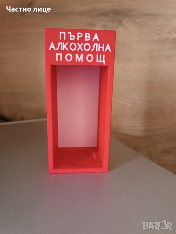 "Аптечка" за първа алкохолна помощ. Пластмасова кутия за поставяне на мини бутилка с алкохол. Височина на кутията 12.5 см. С текст по желание: 7 Евро. Цената е без бутилка.