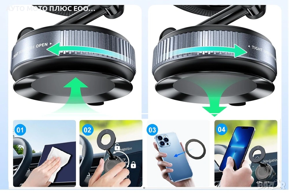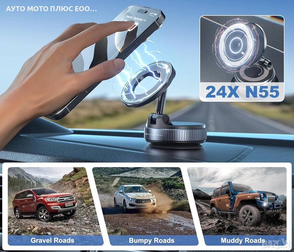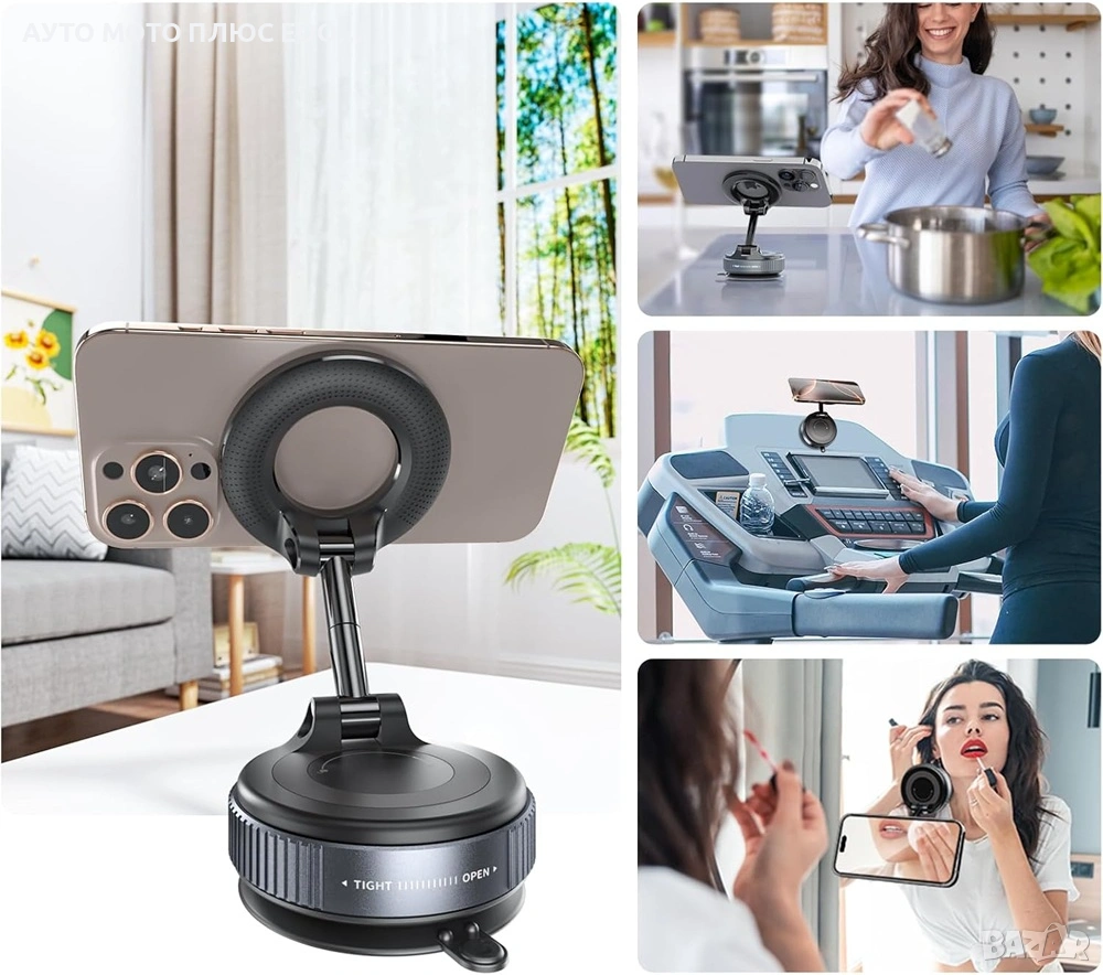 Закрепване: Използва комбинация от вакуумна вендуза за стабилност върху повърхности и мощен магнит за задържане на телефона.