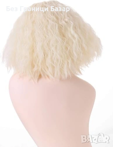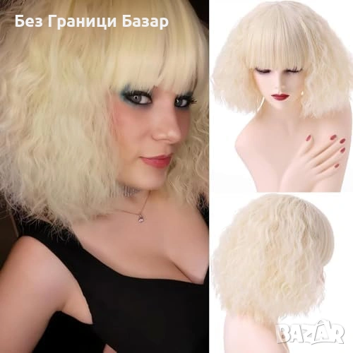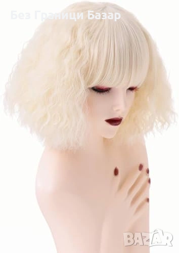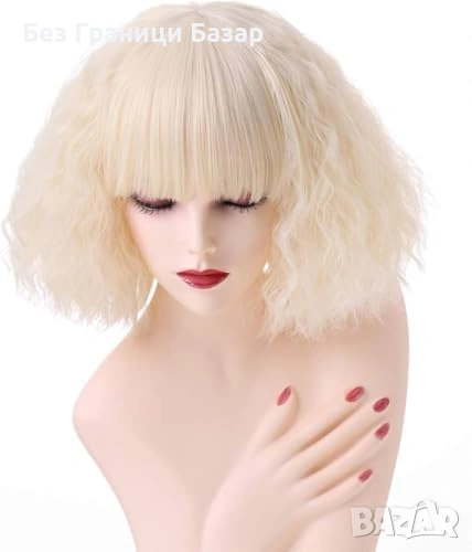 Стилна къса руса перука тип боб – вълниста/къдрава, с бретон