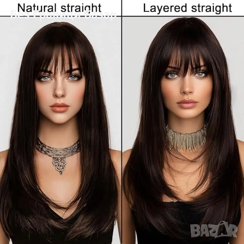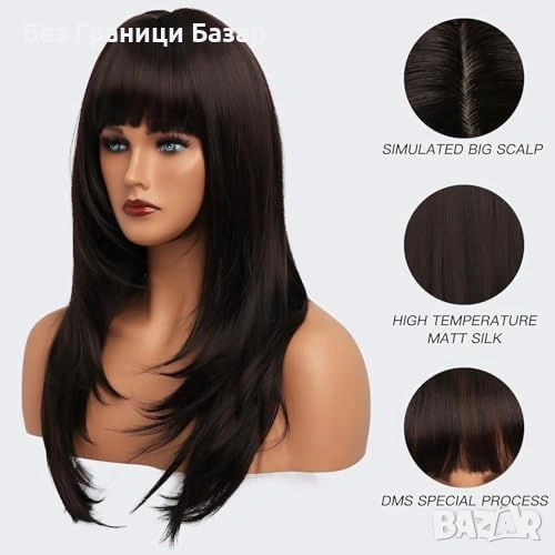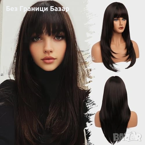Дълга кафява перука 26" с бретон и многопластова (layered) форма