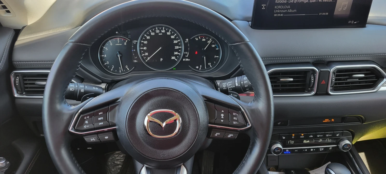 2021 Mazda CX-5 Grand Touring, GT Premium Package 2. 5 Бензин 10000км Автоматична 6 степенна скоростна кутия. Автомобила е в отлично техническо състояние само на 10 000км като нов. Закупен е от мен в САЩ, на 5000км, като там е пострадал от градушка, като тази му щета е напълно отстранена. ViN JM3KFADM1M0377220 Колата е регистрирана и напълно обслужена на 9000км с платени технически преглед , винетка и застраховка. Гори между 7-8л на 100км при нормално каране. Може да се монтира газова уредба. Моделът Grand Touring GT Premium Package е с високо ниво на оборудване което включва: - Два ключа. - Супер обешумена триплекс стъкла - Шумоизолация - Навигация с карти. - Дигитален километраж. - Хед ъп дисплей (на предното стъкло) - гумени и обикновени стелки. - Пера за смяна на предавки. - Ел. Багажник - автоматично отваряне и затваряне от таблото , багажника и от ключа. - - 12 сегментни адаптивни LED матрични фарове (самозавиващи) автоматични светлини (автоматично превключва на къси когато насреща се появи автомобил и после връща на дълги) - Електрически седалки с памет, подгрев и обдухване. Седалките са изцяло от естествена кожа. - Подгрев на външните огледала. - Подгрев на предно и задно стъкло. - Адаптивно, самозатъмняващо се огледало за задно виждане против заслепяване. - Темпомат Адаптивен круиз контрол. - Дистроник Система за следене на предния автомобил и автоматично намаляне/спиране и потегляне. (Много удобно в задръстване и на магистрала). - Камера за заден ход със сензор за движение. - Сензори за дъжд. (Автоматични чистачки). - Bluetooth Hands Free. - Шибидах (Ел. панорамен люк на покрива) - Най-висок клас аудио система BOSE от 10 тонколони и вграден субуфер с кристален и мощен звук. - Два допълнителни USB порта в подлакътника на задните седалки и два в подлакътника на предните - Затъмнени задни стъкла на 70% с топлинен и UV филтър. - Алуминиеви джанти 19 . - ISOFIX. За допълнителни въпроси се свържете на посочения телефон. Възможен оглед в доверен на клиента сервиз след предварителна договорка.