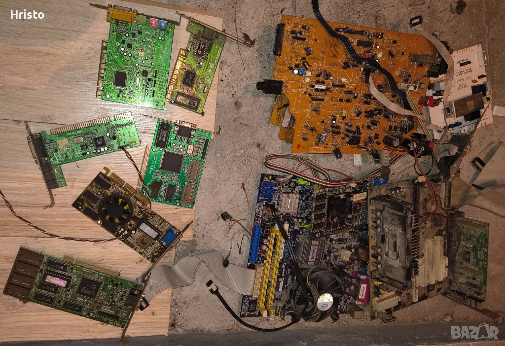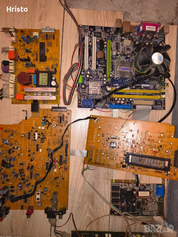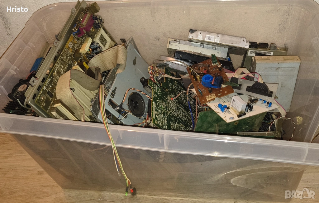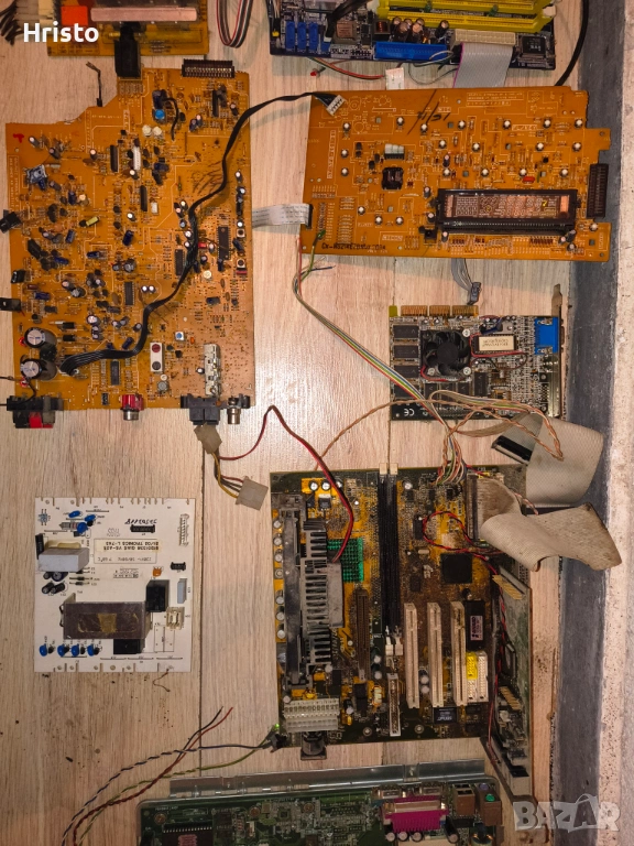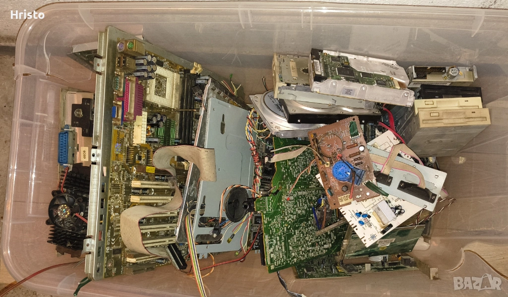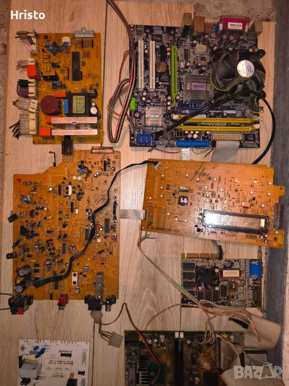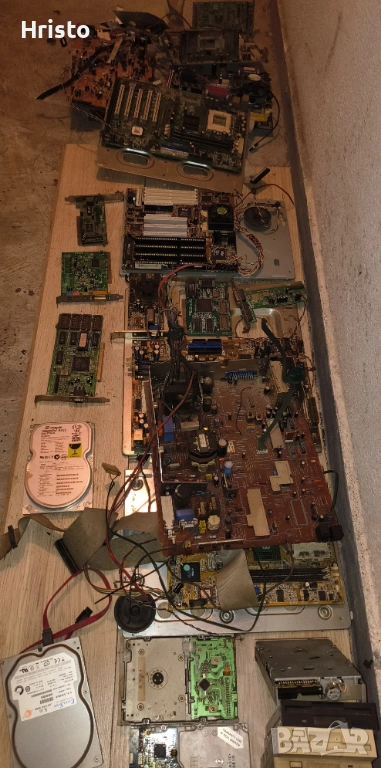 Дъна,рам,процесори,стари лан карти,флопи 6 броя , двд рв 5 броя записвачки,15 броя захранвания,имам и още 4,5 монитора с дефекти,4 компютъра все още сглобени с кутии и няколко лап топа.80% от нещата са работещи но са стари модели,другите са с дефекти има както стари така и нови неща.