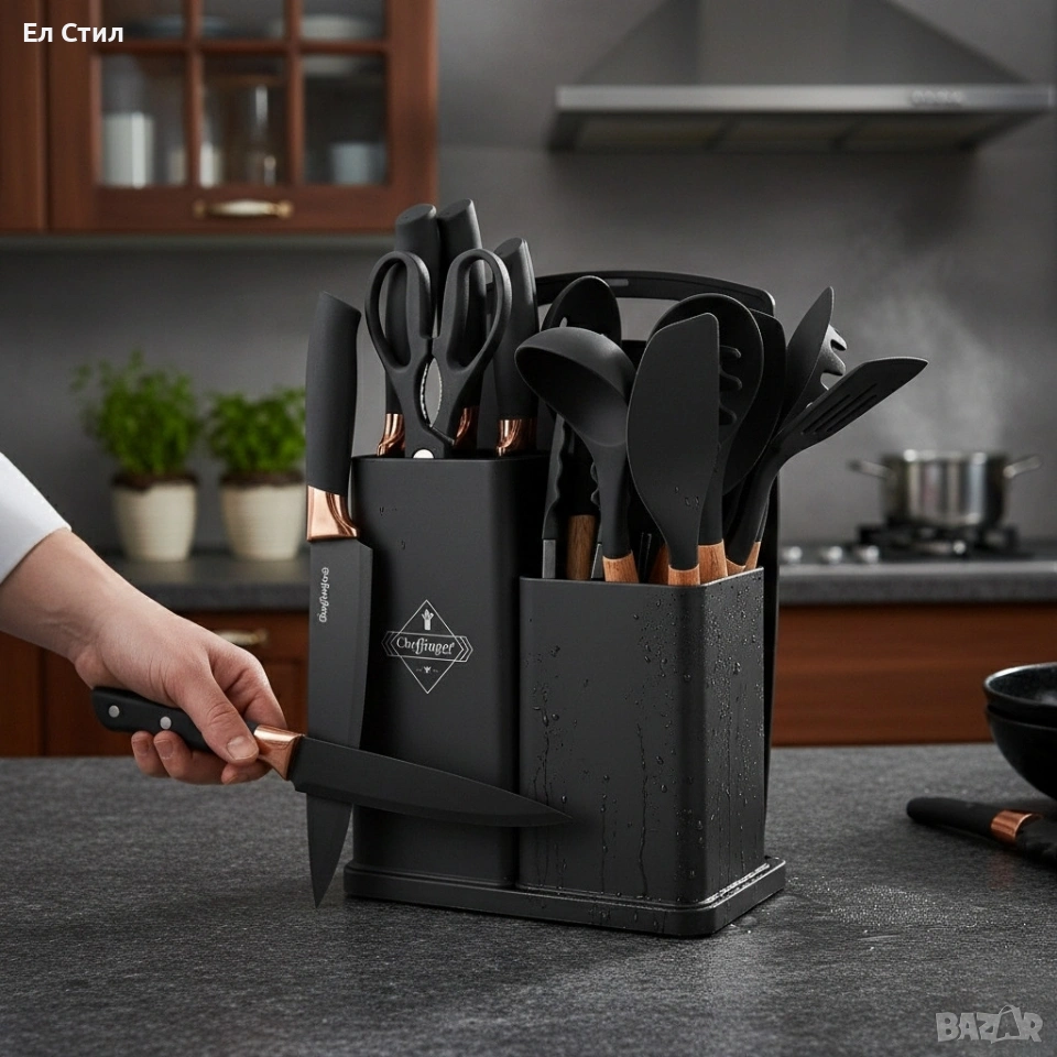 Материал: силиконови кухненски прибори, ножове с метални остриета и ергономични дръжки;