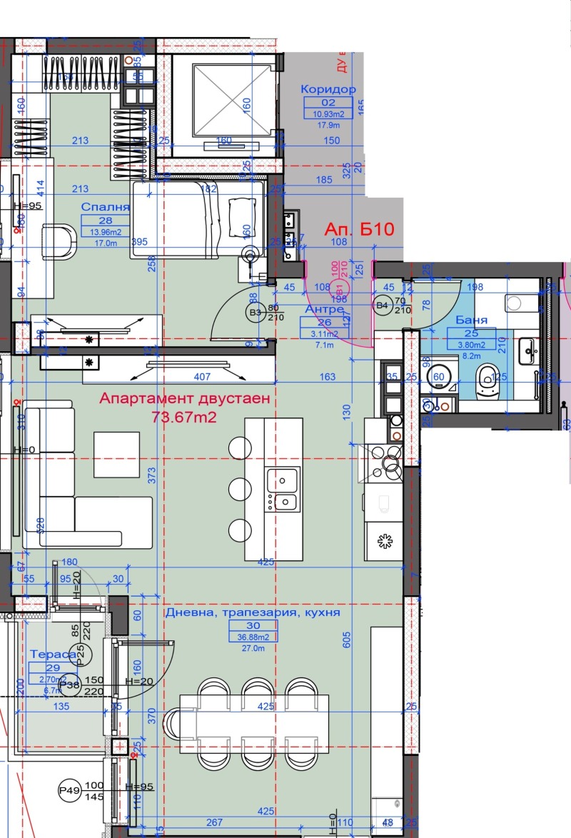 Апартамент Б10 се намира в сграда Б на четвърти етаж, с чиста площ от 73,67 кв. м. , а с общите части е 85,85кв. м. , със следното функционално разпределение: антре с площ от 3,11 кв. м. , дневна, трапезария и кухня с обща площ от 36,88 кв. м. с излаз на тераса с площ от 2,70 кв. м. , спалня с площ от 13,96 кв. м. , баня с тоалетна с площ от 3,80 кв. м.