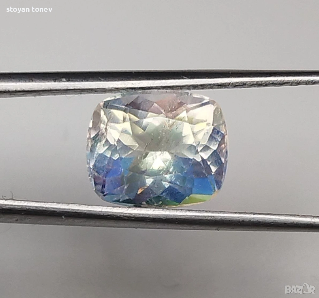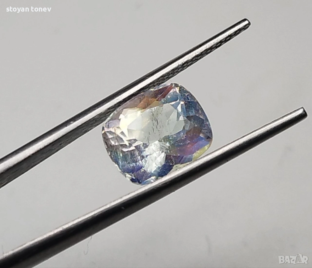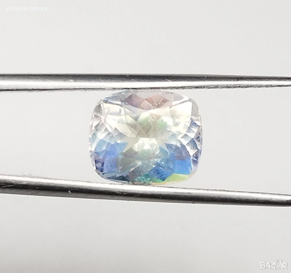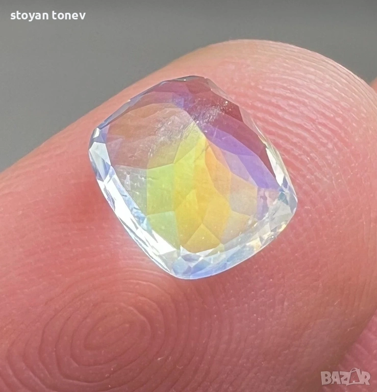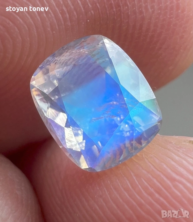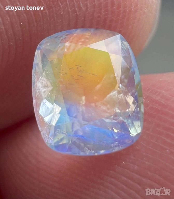 Това е top quality екземпляр – чист, с интензивен multi-fire (не само синьо, а пълна дъга), което е рядко за rainbow moonstone.