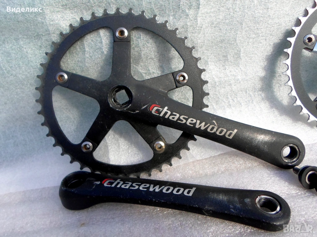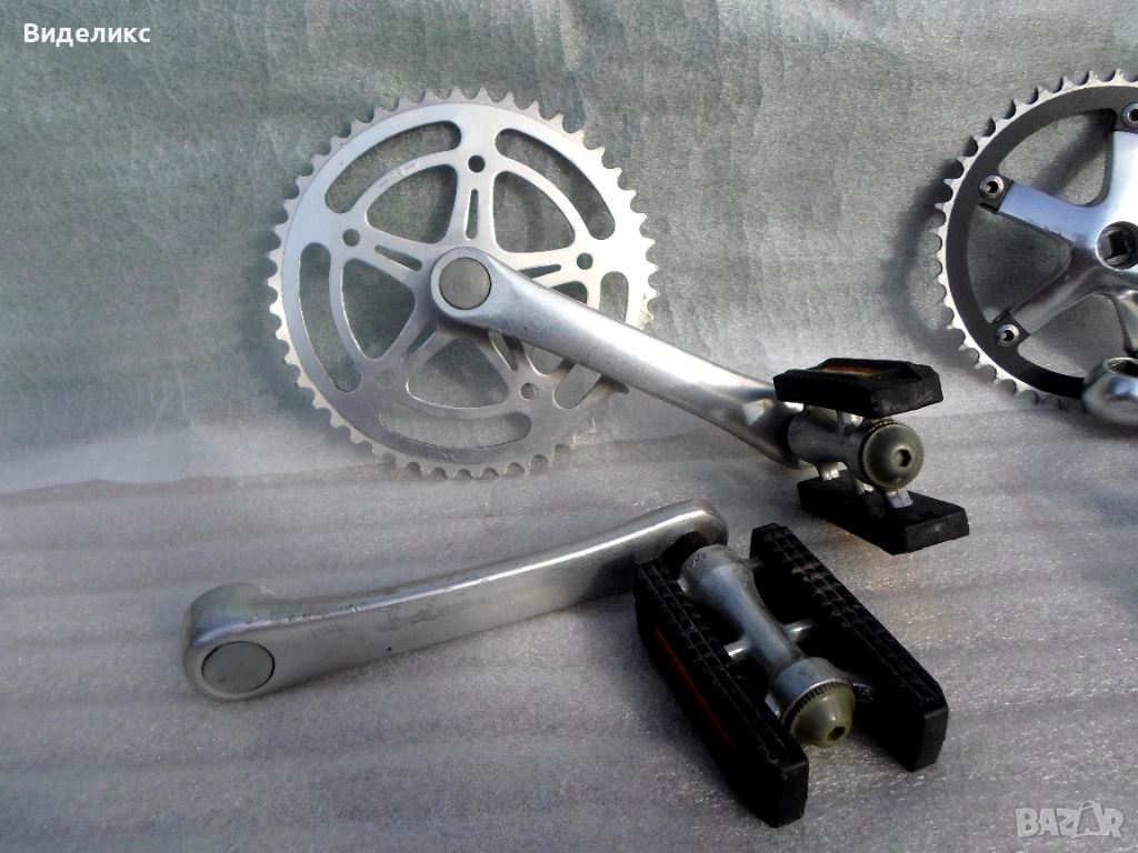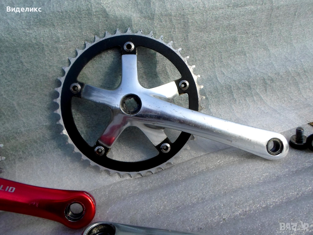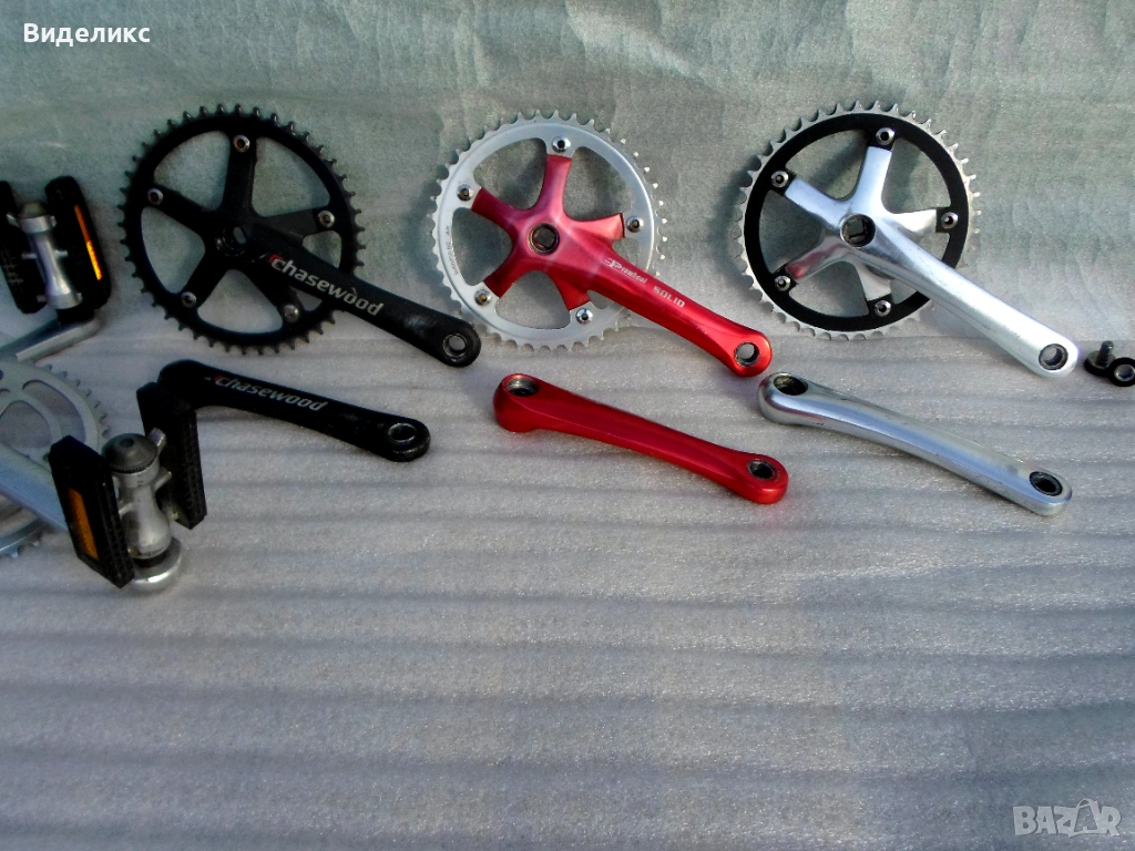 Курбели за fixie"single speed bikes .Lasco/165mm ,42 зъба/,Prowheel Solid/165mm, 42 зъба/,Chasewood/175mm, 44 зъба/.И трите са с BCD 130.Ретро курбел сингъл SR/Sakae Ringyo/с педали също SR.Цената е за чифт.