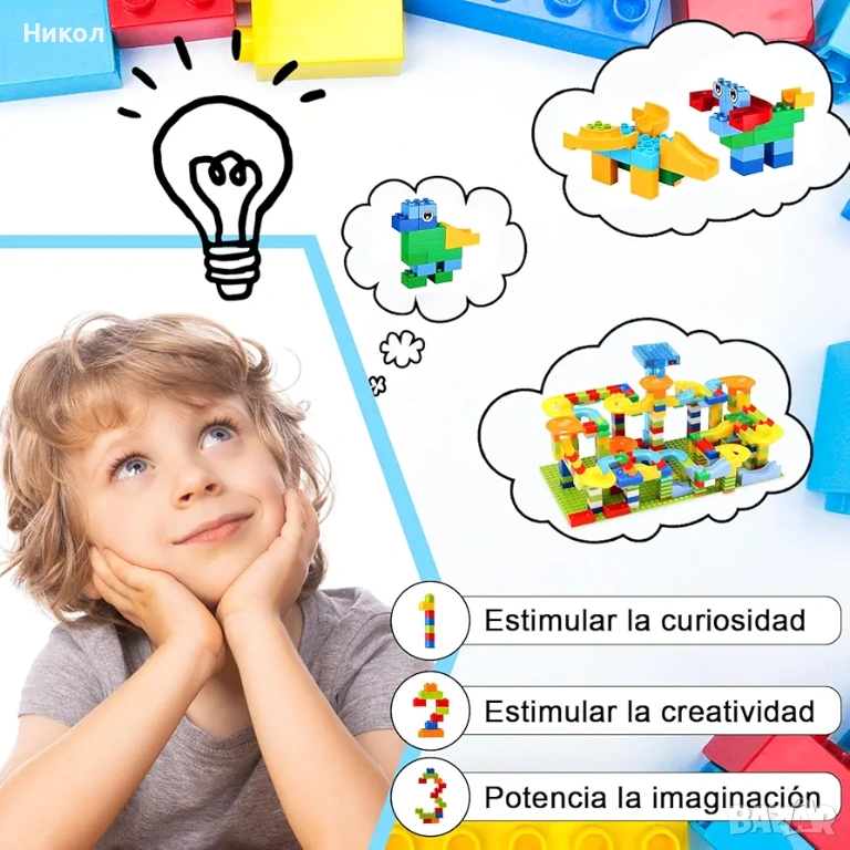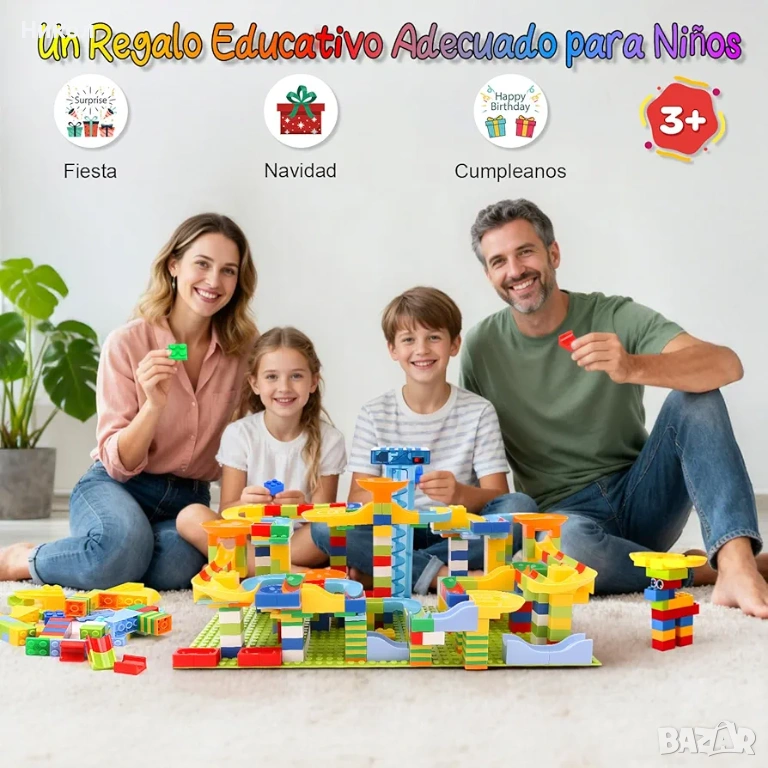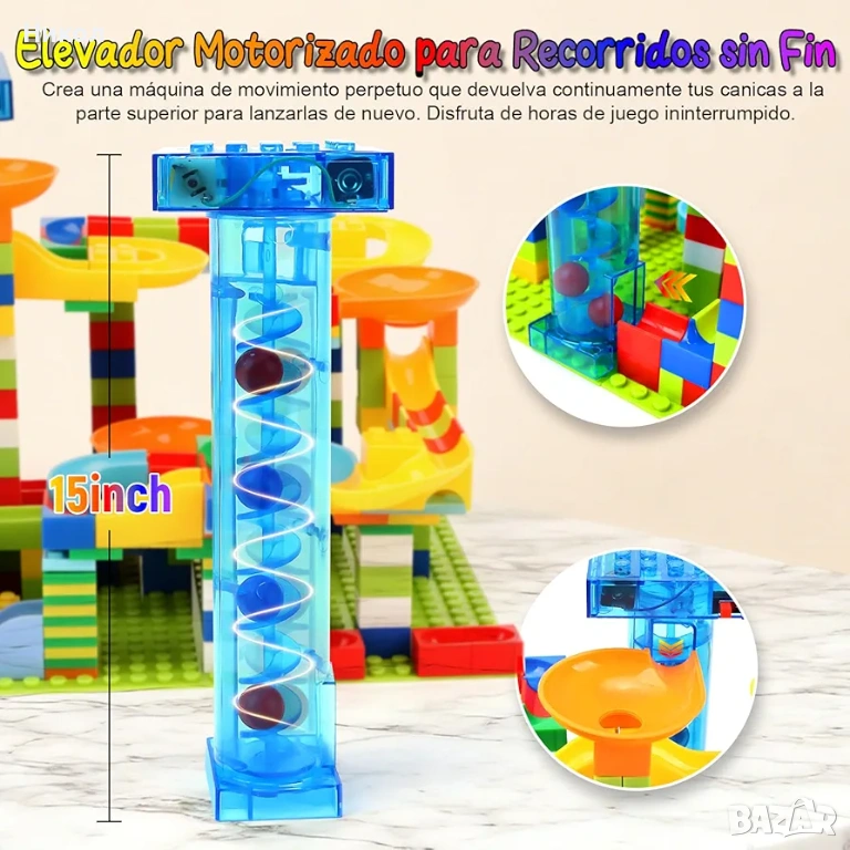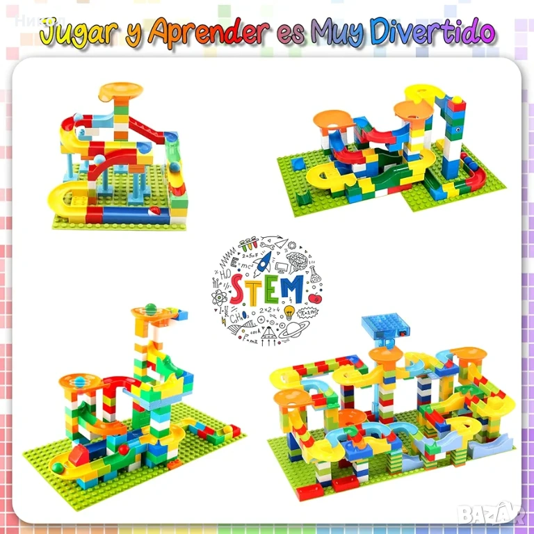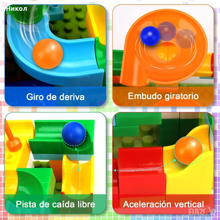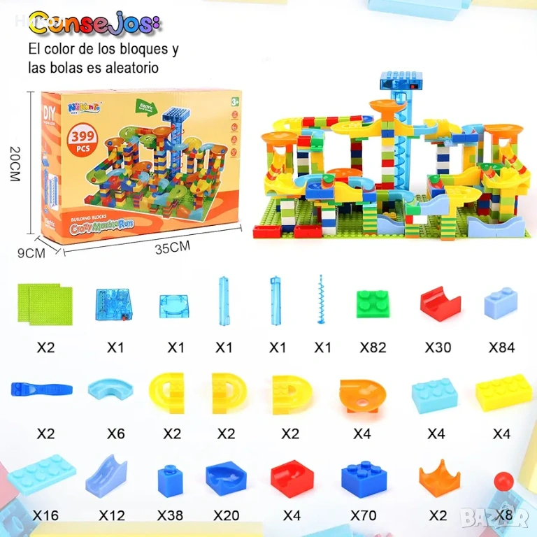 Комплектът е набор от ярко оцветени блокчета и части, които децата могат да използват, за да построят вълнуваща писта с топчета. Съдържа 399 елемента за сглобяване на път за спускане на топчета. Развива въображението, моторните умения, логическото мислене и прецизността.