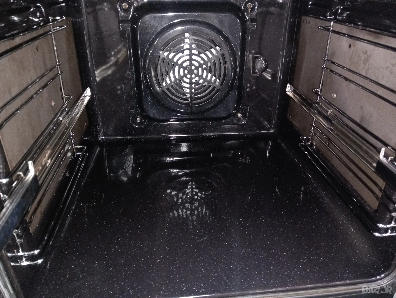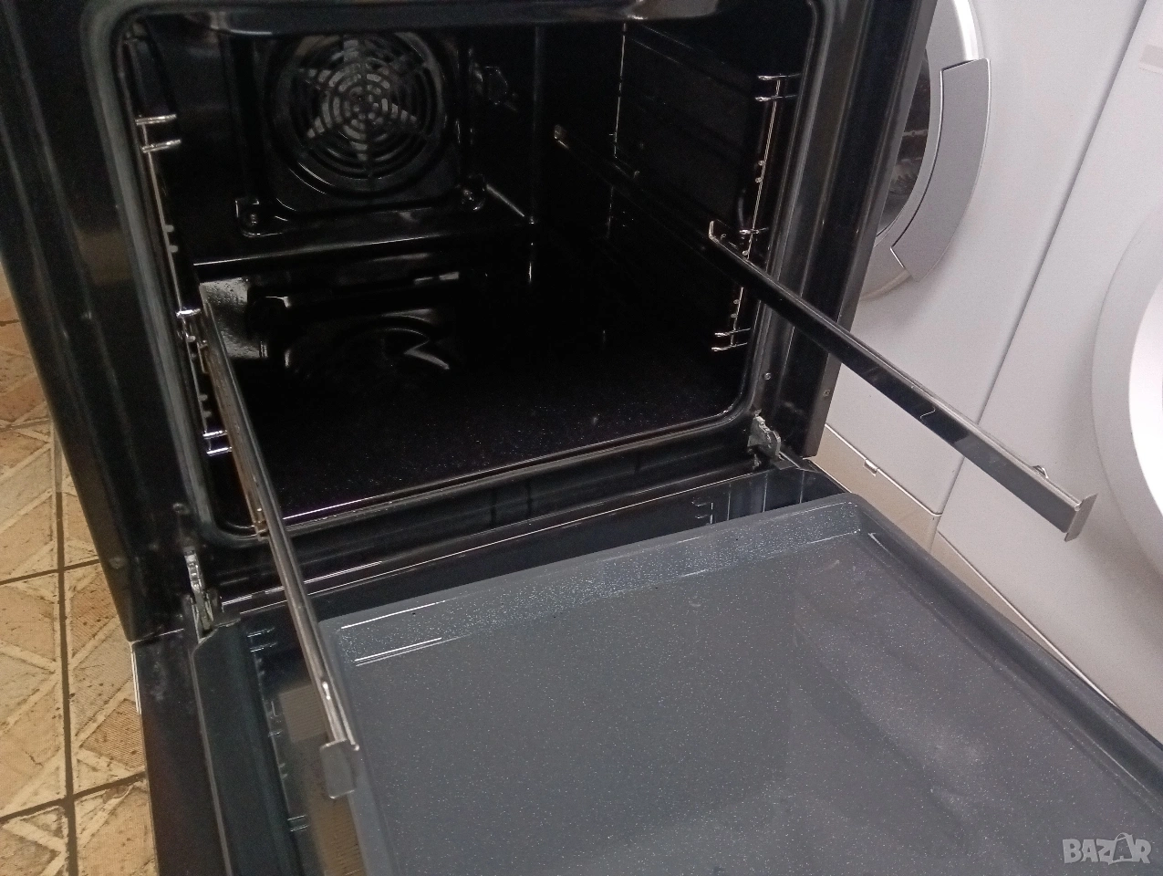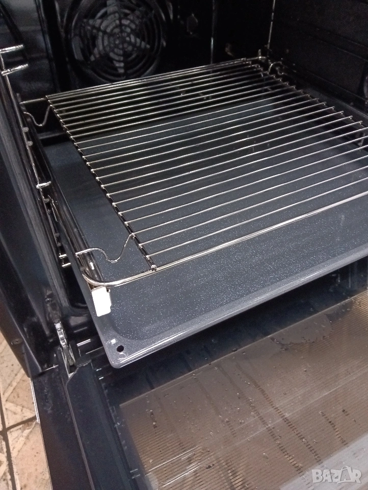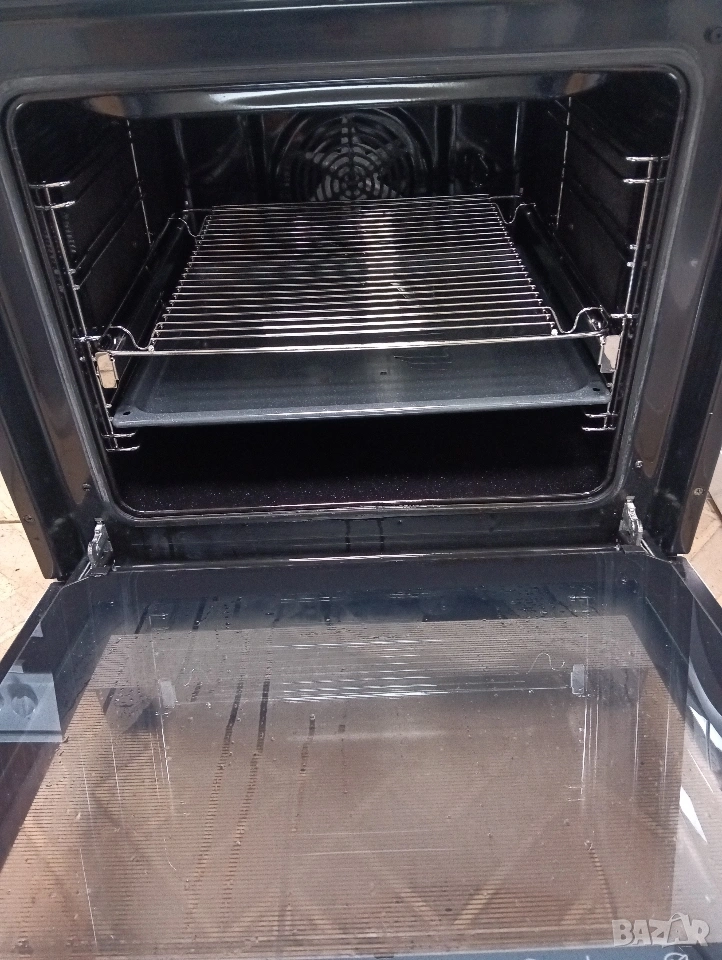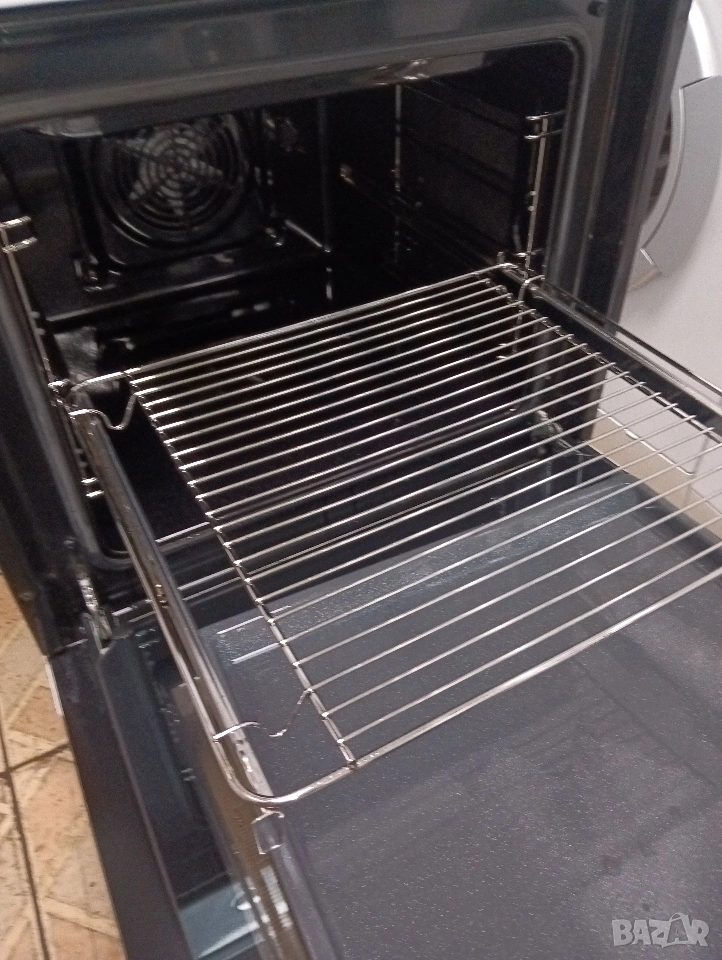 Печката е широка 60 см има вентилатор, грил , пуш бутони, телескопични решетки и др.