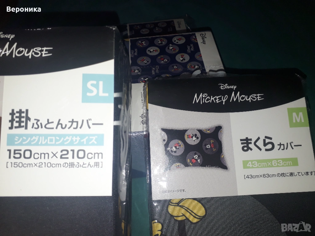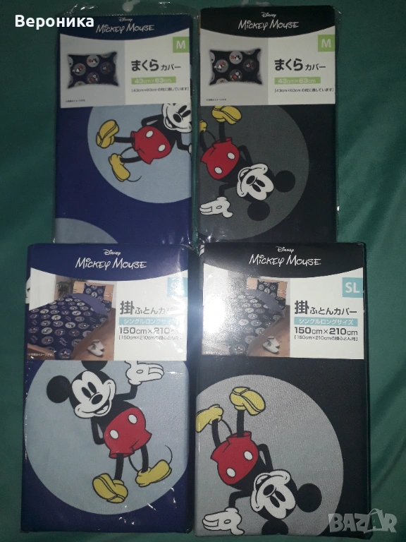 Оригинални нови спален горен плик 150х210 см и калъфка 60х43 см, материал 100% полиестер, произведени от японска фирма Морища по лиценз на Дисни. Има два налични комплекта: черен и тъмно син. Единична цена 20 евро. За двата комплекта 35 евро.