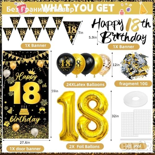Нов Комплект украса за 18 рожден ден черно злато банер и балони парти