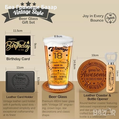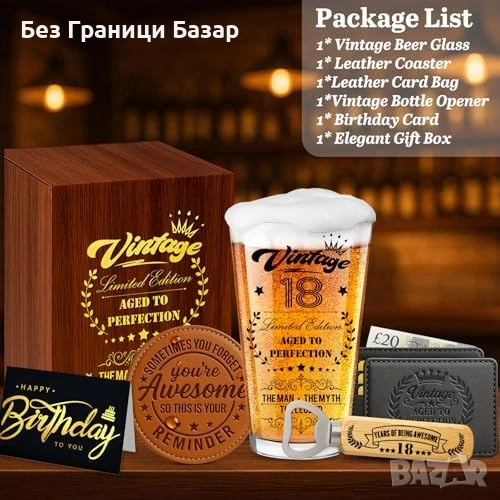 Нов Винтидж подаръчен комплект 18 години – чаша, портфейл, отварачка