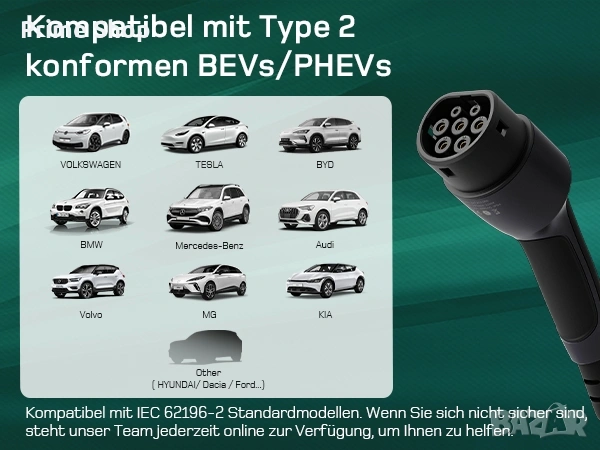 * Пълна съвместимост с всички електромобили и Plug-in хибриди, използващи стандартен конектор Type 2.