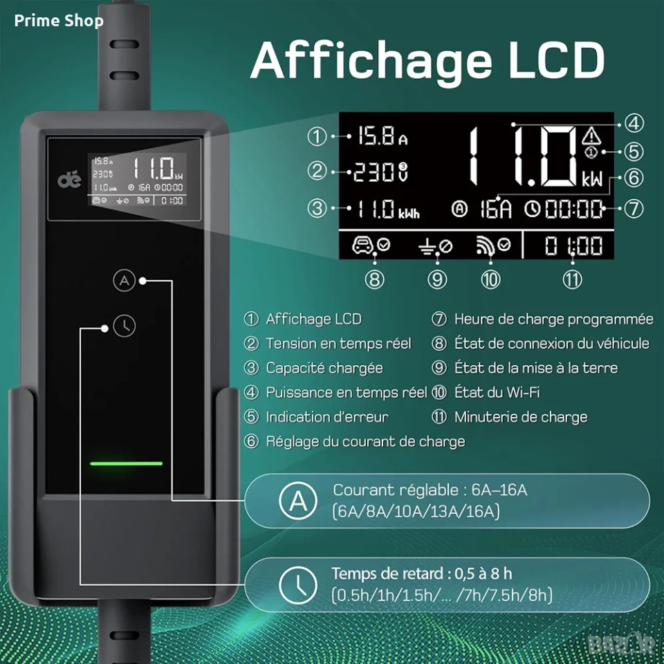 * Функция за отложен старт от 0.5 до 8 часа, позволяваща зареждане в часове с по-ниска тарифа на електроенергията.