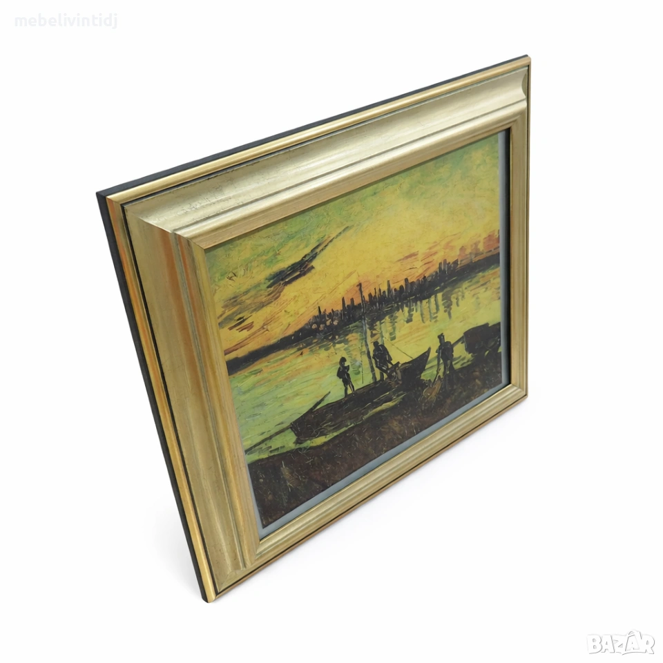 ✅Картина в златиста рамка – пейзаж със залез и лодки Елегантна декоративна картина с топли залезни тонове, изобразяваща градски силует и лодки край водата. Поставена в стилна златиста рамка с допълнителен кант