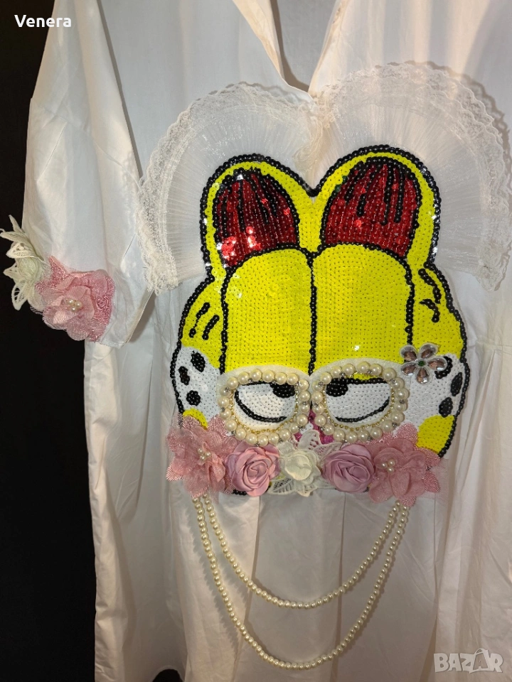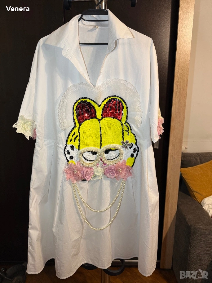 Роклята е универсален размер. Без етикет , обличана веднъж , няма забележки.