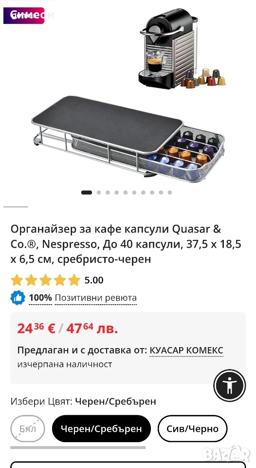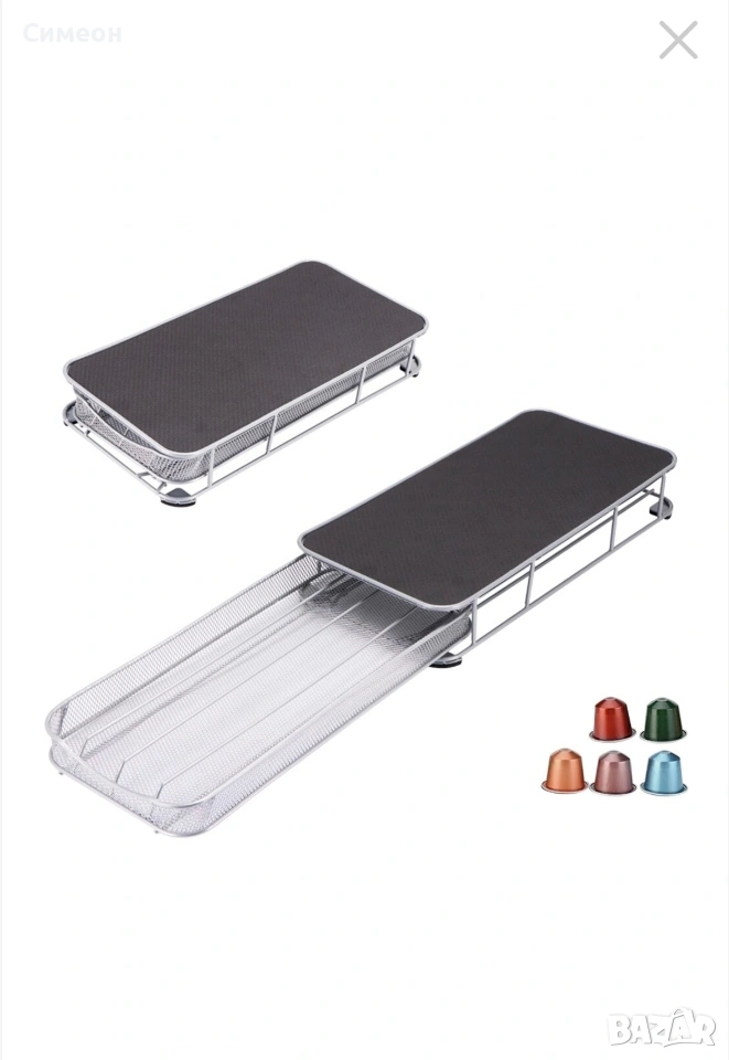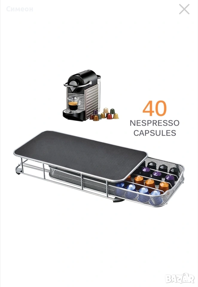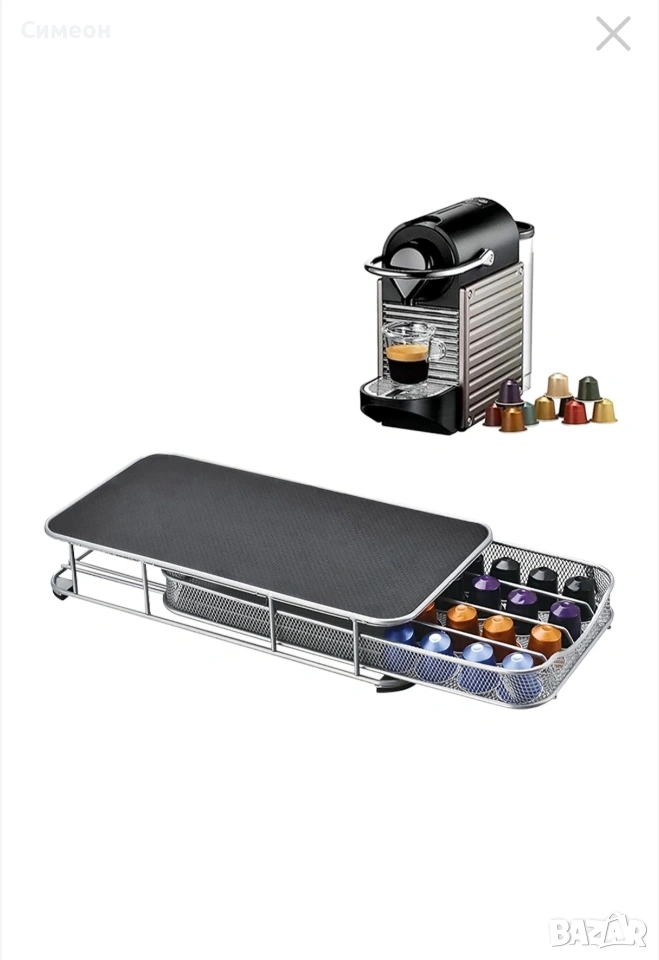 Държач за капсули за кафе, капучино, кафе лате, шоколад, чай. Горната повърхност е с гумирано покритие против хлъзгане. Снабдена е с гумирани крачета за по-добро сцепление. Капацитетът му за съхранение е 40 капсули. Този стелаж за съхранение лесно ще намери място навсякъде, където искате да го използвате. Поставете кафемашината отгоре, за да спестите място. Не се изисква сглобяване Държач за капсули за кафе, капучино, кафе лате, шоколад, чай. Много прост и ергономичен начин да ги съхранявате по стилен начин. С луксозен дизайн и стоманена рамка, поставката за касети може да се постави под кафемашината за еспресо, като истинска стойка, с капацитет от 40 капсули. Съвместим с всички капсули Tassimo Nespresso. Цвят: сребрист/черен Материал: метал Марка: Quasar & Co. Размери: 37,5 x 18,5 x 6,5 cm (Д x Ш x В)