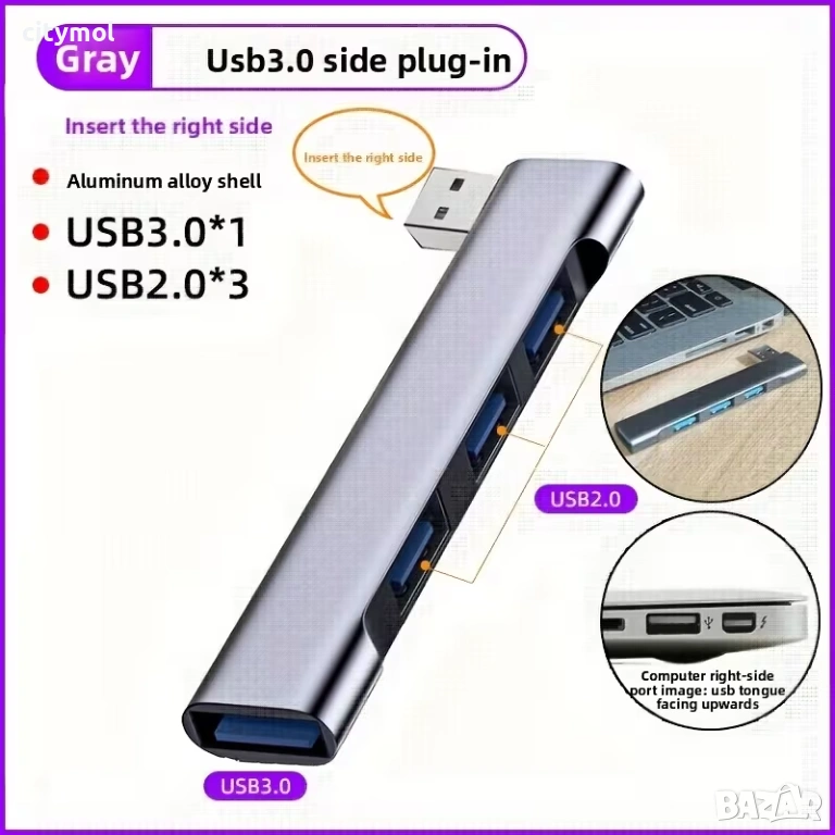 Този USB хъб е универсално устройство, което предлага високоскоростен трансфер на данни и множество опции за портове. Той се отличава с елегантен сребрист и сив дизайн, с 4 х USB порта, включително и 3.0. USB 3.0 портът има теоретична скорост от 5 Gbps, 10 пъти по-бързо от . Тялото е изградено от издръжлив изцяло алуминиев корпус, който осигурява по-добра защита от пластмасата, осигурявайки дълготрайна работа.