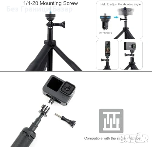 Широка съвместимост: GoPro Hero 13/12/11/10/9/8/7/6/5/4/3/2/1, Fusion, Session, Max, Insta360, DJI Action 6/5/4, AKASO и други екшън камери