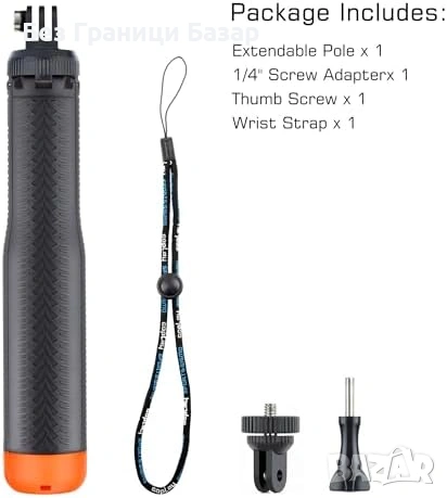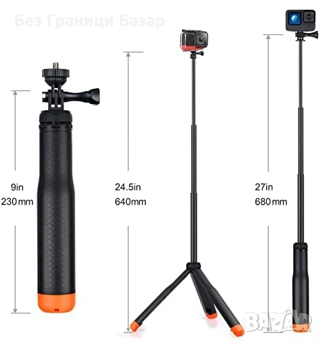 4-в-1 дизайн: плаващ селфи стик/дръжка, телескопичен монопод, ръкохватка, трипод за равна повърхност