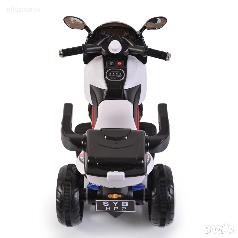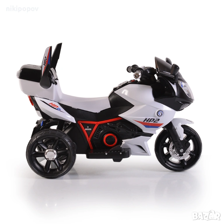 Акумулаторен мотор HP2 e с 3 гуми и е подходящ за деца от 3 до 6 години и максимално тегло 30 кг. Мотора е с един двигател, 1 скорост – 5 km/h, превключвател за включване/ изключване, с музикални функции с опция за регулиране силата на звук и задна кошница за играчки.