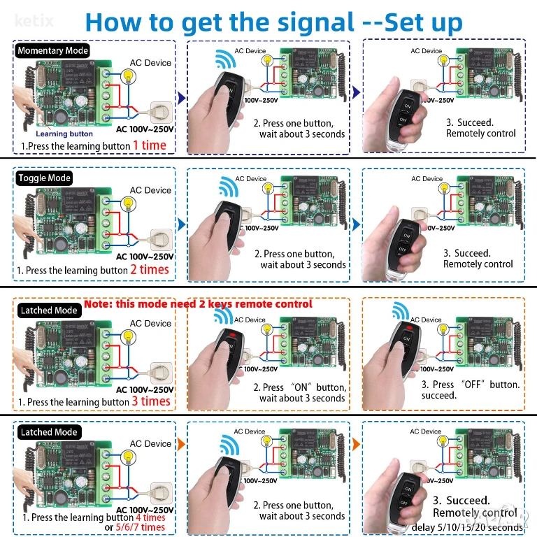 Лесен за употреба: Изключително лесен за настройване и нулиране. Това е програмируем комплект за дистанционно управление. Могат да се програмират 4 режима на работа (моментен / превключвател / заключен / режим на закъснение). Можете лесно да програмирате сами в зависимост от вашите нужди. Режимът на работа на продукта е регулируем. Този елемент вече е настроен в заключен режим.