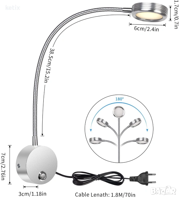 Регулируема светлина с тъчскрийн бутон – тази стенна лампа за четене предлага 3 цветни температури 3000K/4000K/6000K с кратко натискане, от които да избирате. С продължително натискане светлината става по-ярка или по-тъмна. Мощност: 4 W, висококачествен LED.