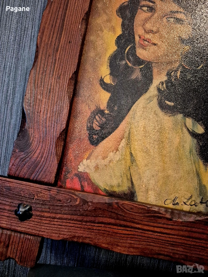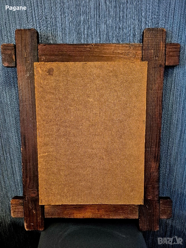 ​Рамка: Оригинална, масивна дървена рамка в рустикален стил с декоративни метални елементи. Рамката е изключително запазена и сама по себе си е ценен интериорен акцент.
