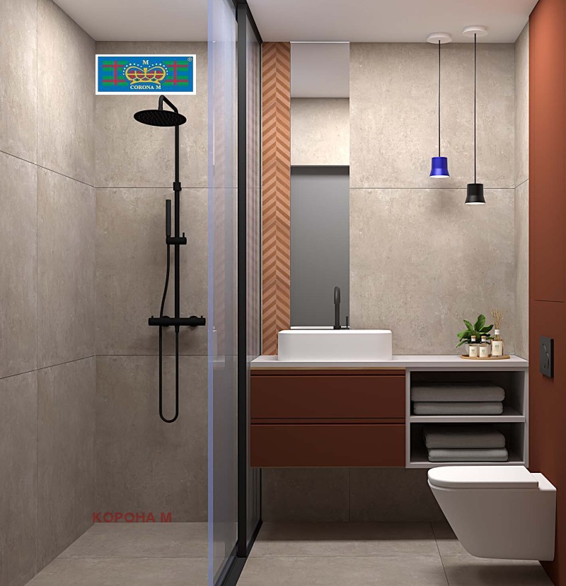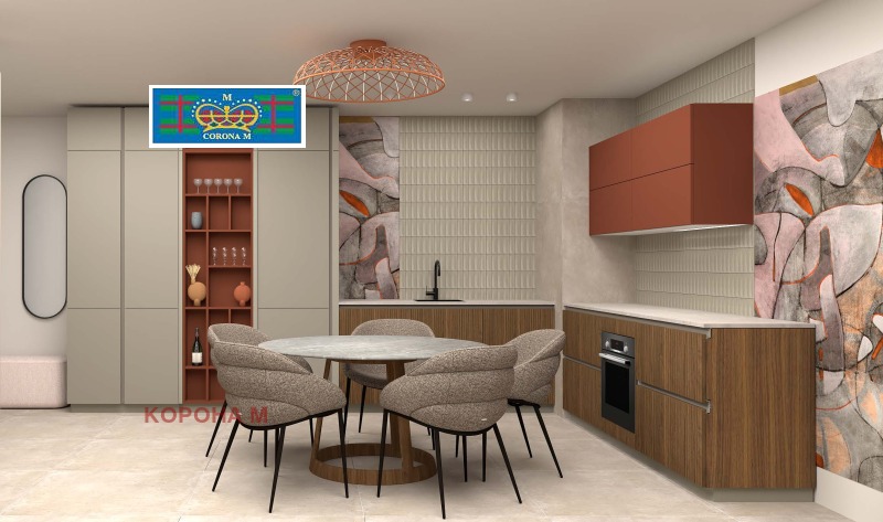 Апартаментът е завършен в съвременен, топъл и елегантен стил с фокус върху качествени материали, функционални решения и спокойна цветова палитра: пясъчни нюанси, дървесни текстури и акценти в теракота. Всяко помещение е проектирано за ежедневен комфорт сдобре премислени зони, скрити механизми и плавно затваряне, пълновисоки завеси и дискретно, многопластово осветление.