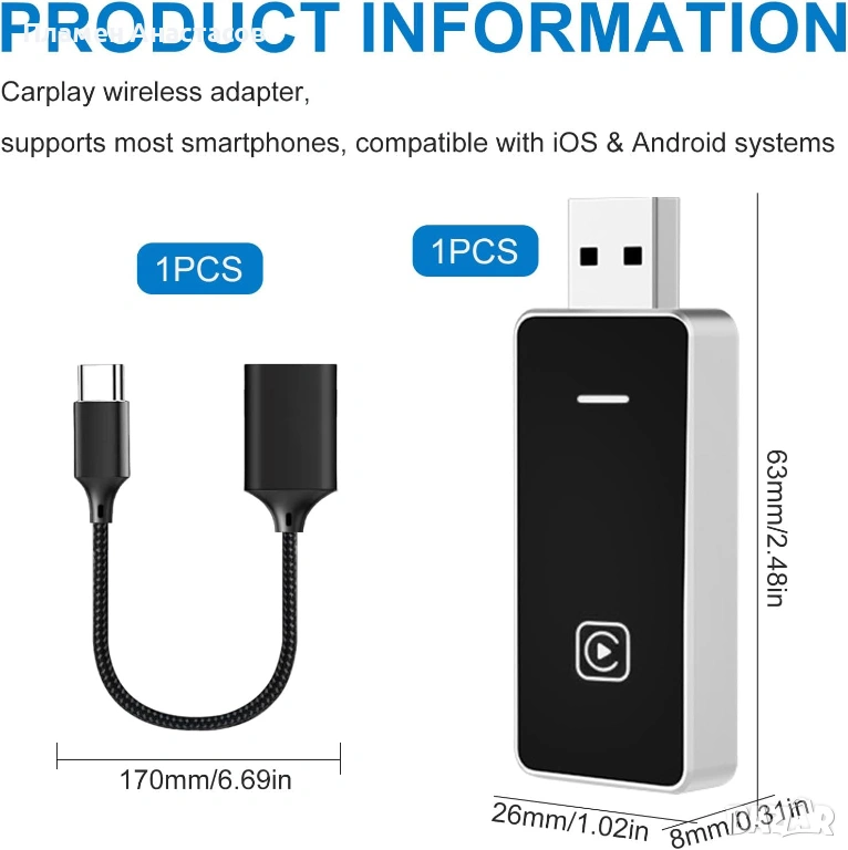 Безжичният CarPlay и Android Auto адаптер позволява лесно преобразуване на кабелен CarPlay или Android Auto в безжичен, без нужда от сложен монтаж. Просто го включвате в USB порта на автомобила и превръщате фабричната система в wireless решение за по-удобно и модерно шофиране.