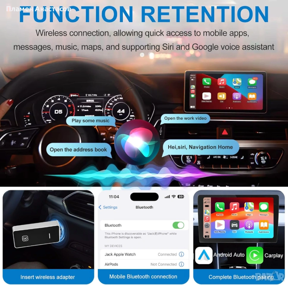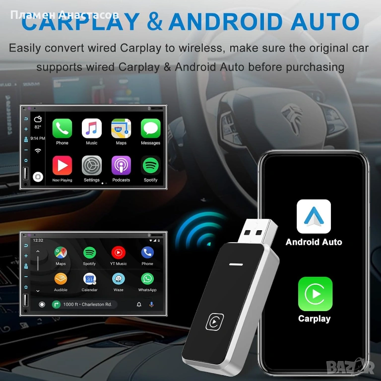 Безжичен CarPlay и Android Auto адаптер – Wireless Car Adapter Plug & Play (за автомобили след 2016 г.)