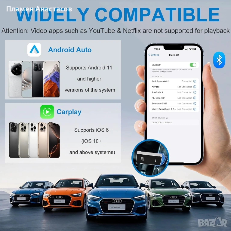 Адаптерът е съвместим с повечето автомобили, които поддържат жичен CarPlay или Android Auto, произведени след 2016 г. Работи с iPhone (iOS 10+) и Android устройства (Android 11+), като след първоначалното сдвояване връзката се осъществява автоматично при всяко стартиране на автомобила.