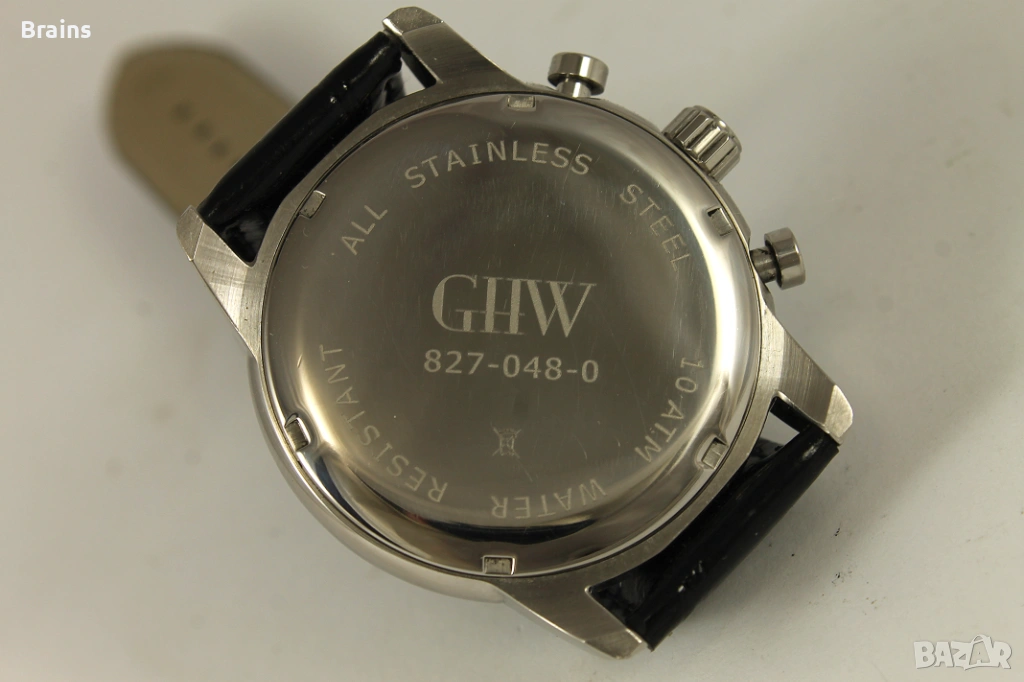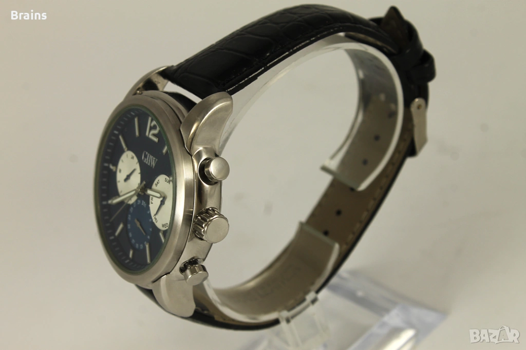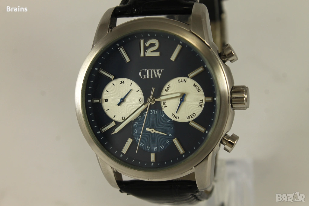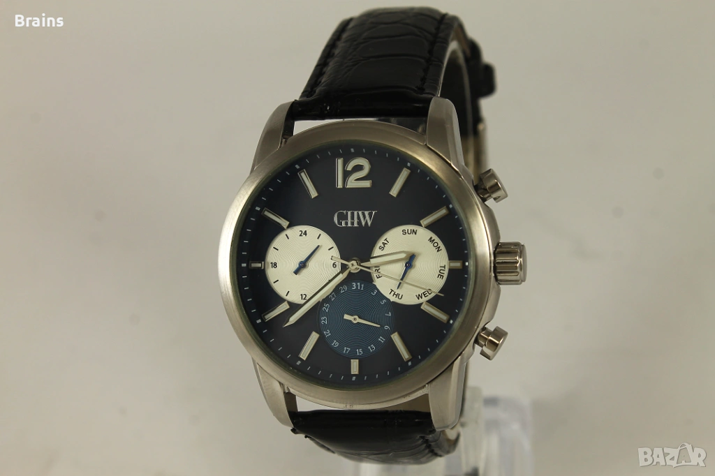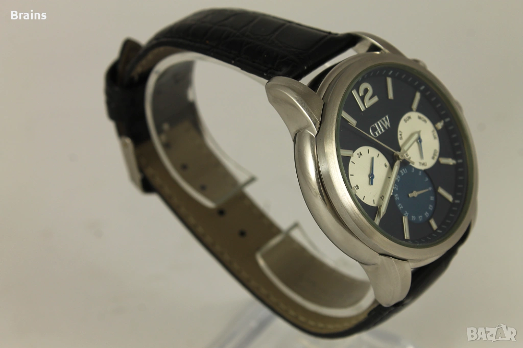 Красив мъжки кварцов часовник GHW . Японски кварцов механизъм. Функции - Ден от седмицата, Дата и 24 часово отчитане. Часовника работи точно, всички функции работят коректно. Каса изработена от неръждаема стомана. Часовника е в перфектно визуално състояние, без забележки.
