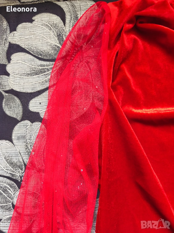 Червена дамска блуза с гръцко деколте и прозрачни ръкави с фин блясък.Материята е като плюш,ръкава е с набор на рамото.Чисто нова.Ширина под мишницата едностранно 55 см, дължина 62 см.