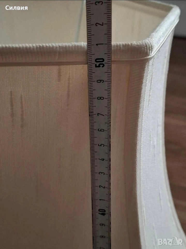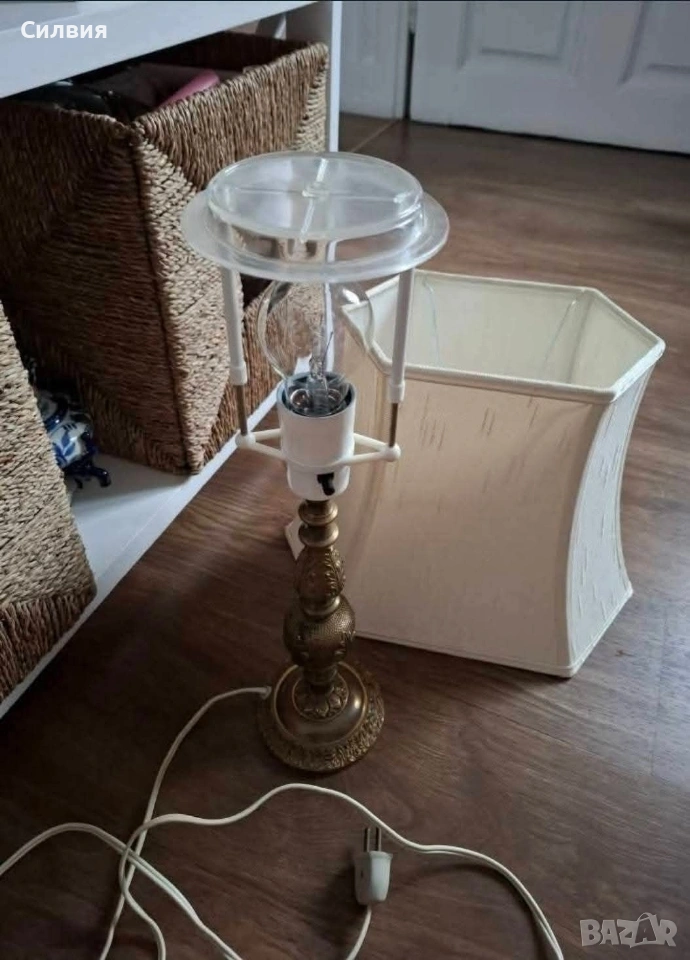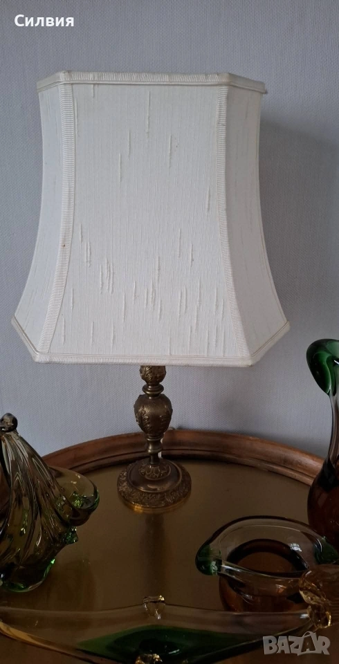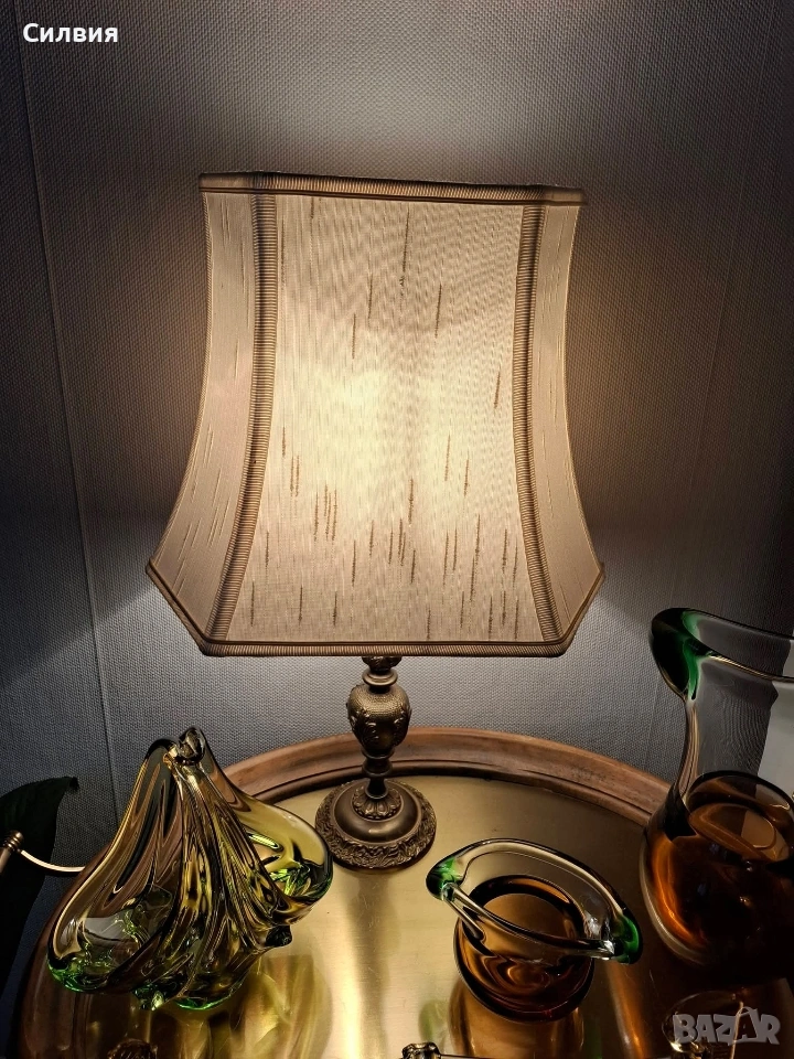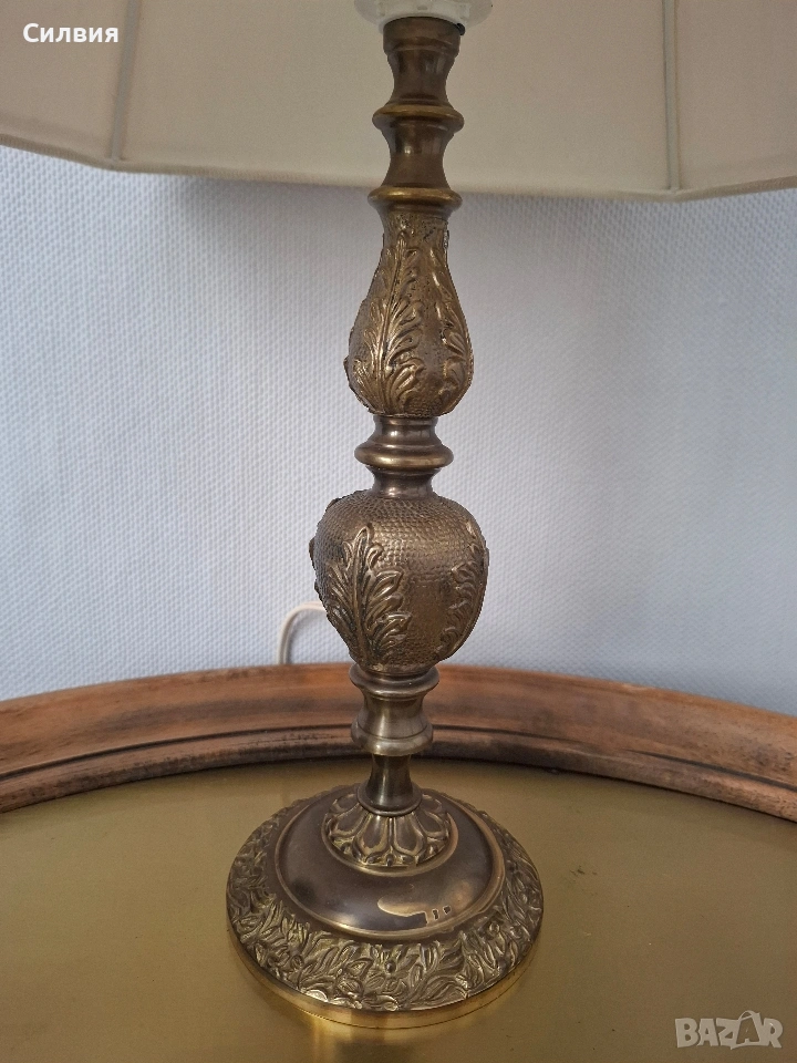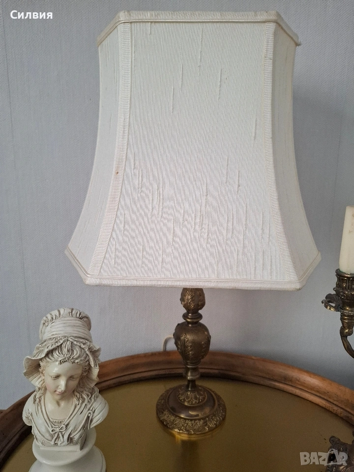 Елегантна Настолна Лампа в Античен Стил (Френски/Бароков Дизайн) Красива, масивна настолна лампа, която моментално добавя класа и уют във всяко помещение – от хол и спалня до работен кабинет. Основа : Масивна основа (бронз) с богата, детайлна релефна декорация в стил Барок/Рококо. Античният бронзов/златист цвят придава вид на патина и лукс. Този дизайн често се асоциира с класически френски декор. Абажур: Голям, елегантен абажур с форма на камбана (или трапец), обшит с екрю/кремав плат. Материята е с фини вертикални релефни ивици, които омекотяват светлината и създават топла и уютна атмосфера. Размери: Височина на абажура: Около 27см. Обща височина на лампата: 50,5 см. Размери на основата: около 27см. Има 17см приспособление с крушка и ринг, на който стои абажура. На него има и копче за включване/изключване. Цена 6️⃣0️⃣€ 117,35лв