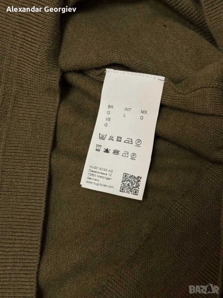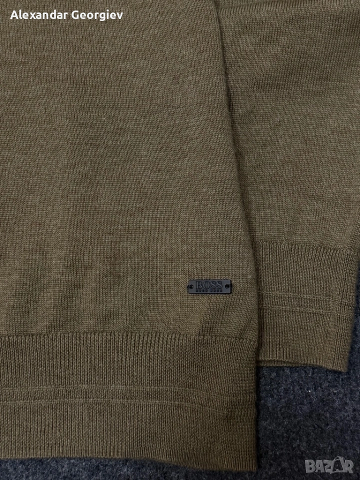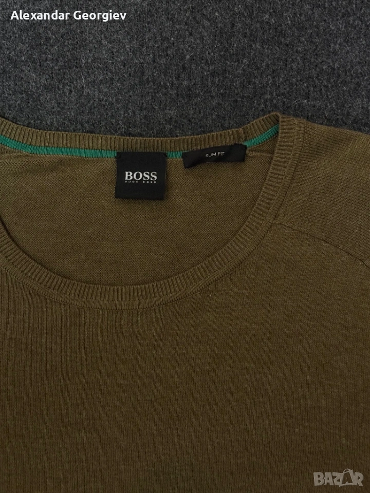 Маслено зелено фино плетено горнище с изчистен дизайн и метална BOSS плочка. Slim fit кройка и мека материя, която стои прибрано и комфортно.