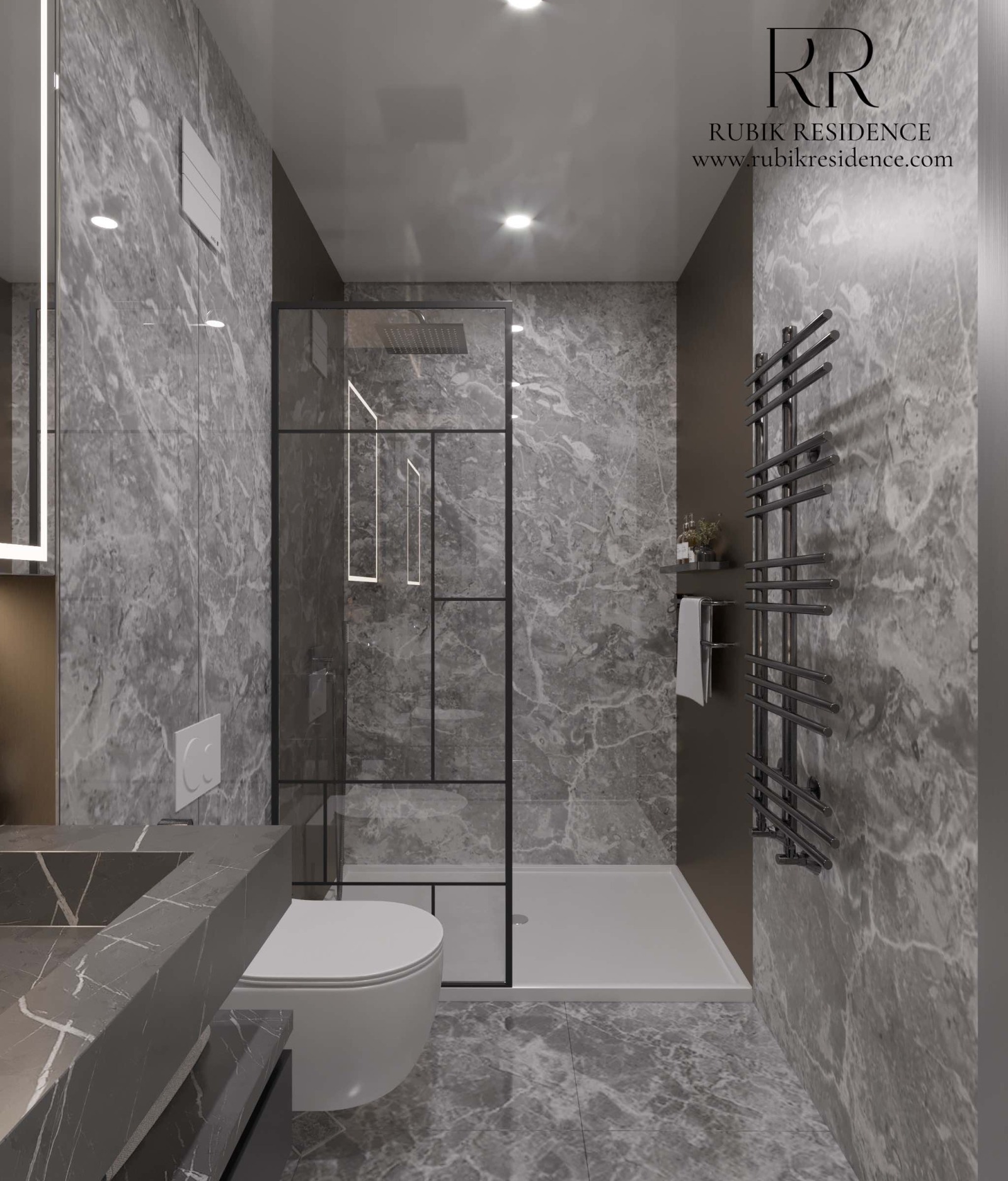 Баните са изработени от мрамор и драскан метал, които създават луксозна и модерна атмосфера. Оборудването на баните включва мивка, огледало, параван, душ корито, смесител и вградена структура. Мивката е вградена в шкаф с плот от мрамор, който осигурява пространство за съхранение. Огледалото е с вградено осветление. Параванът е от стъкло и метал, който разделя мократа зона от останалата част на банята. Дизайнът на баните е елегантен и функционален, като предлага комфорт и качество.