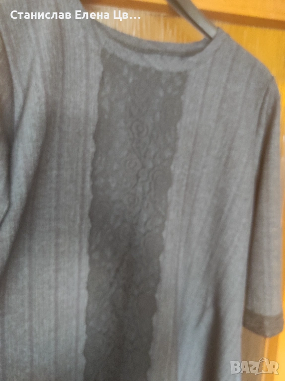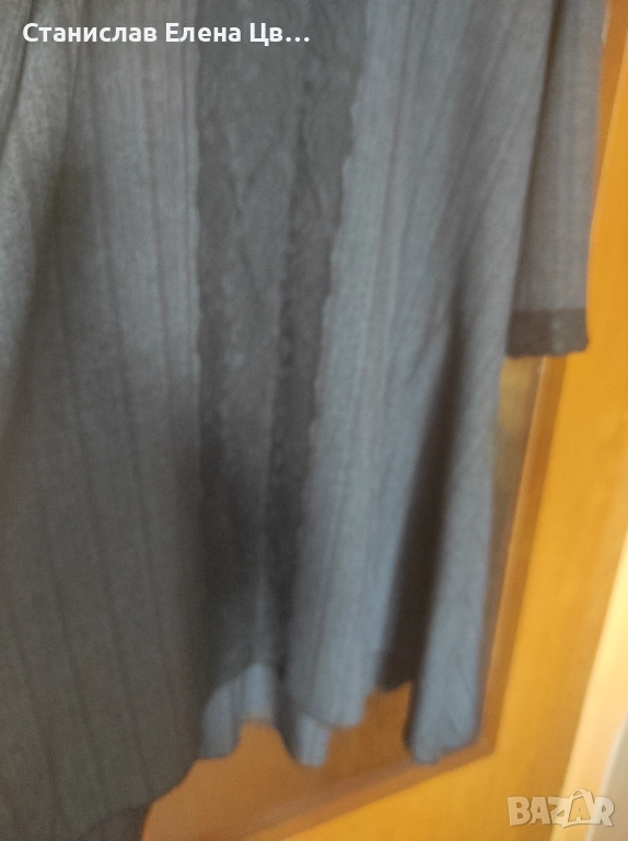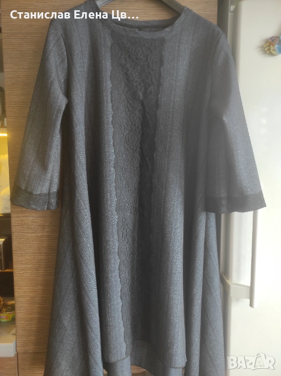 Рокля тъмно сива с декорация черна дантела на ръкавите и отпред, пада тежко, разкроена без размер. Закупена от Fetish.