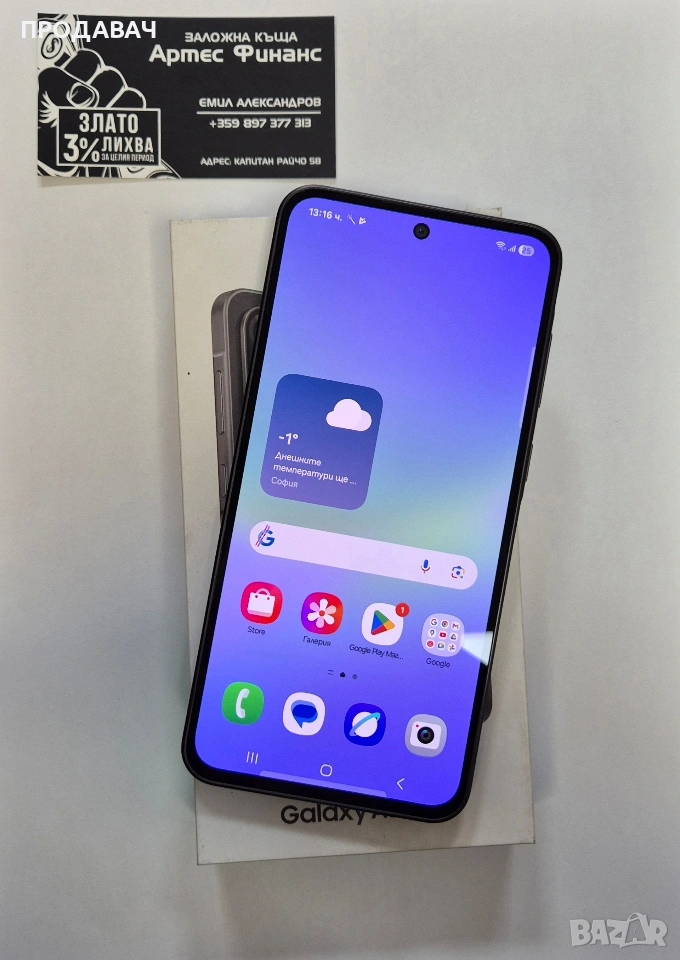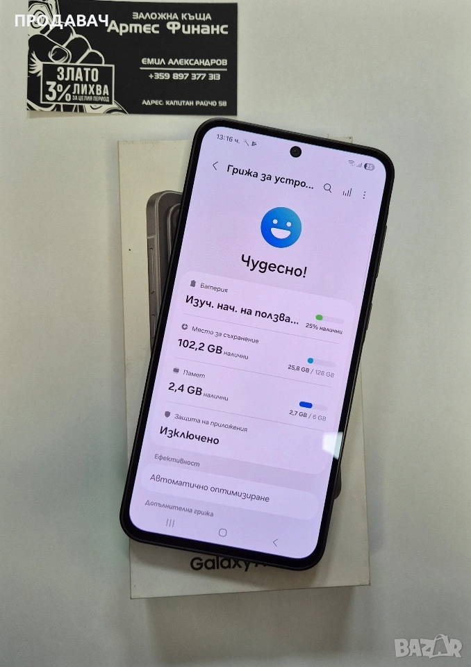 Телефонът е нов на 25 цикъла на зареждане. Разполага с 128GB вътрешна памет и 6GB RAM. Пълен комлект с гаранция до 30.06.27.. С подарък калъф. Изпращаме с опция преглед и тест за цялата страна.