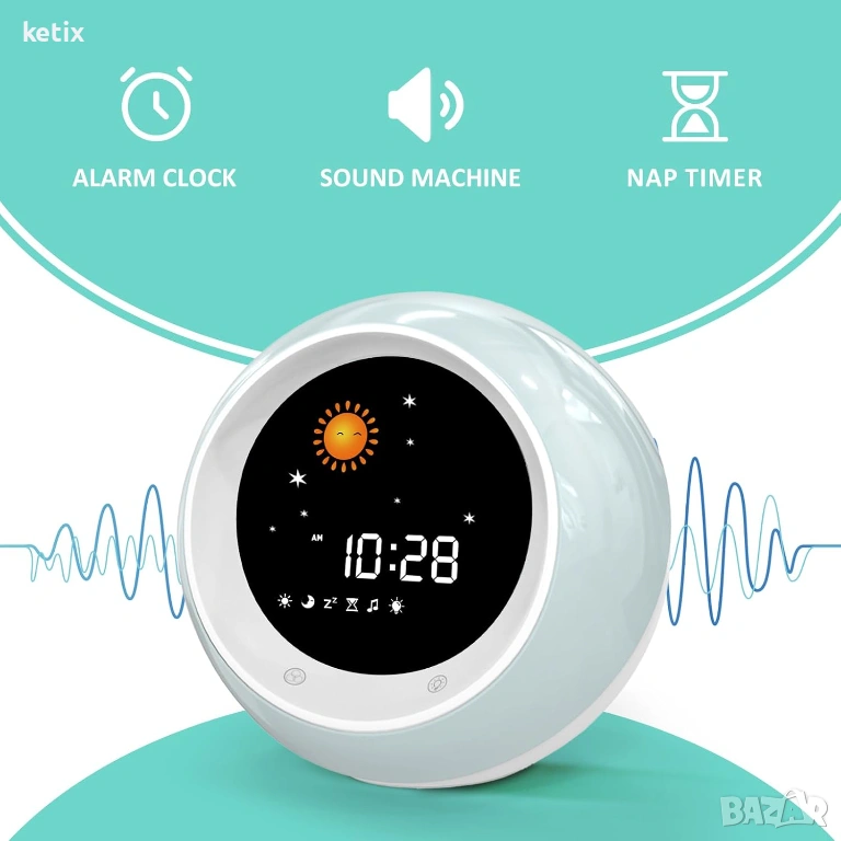 Часовник за сън „Слънце и Луна“- В сравнение с номерата на будилника за малки деца, ИКОНИТЕ са интересен начин децата да разберат концепцията за времето. Сутрин, когато „слънцето“ се появи на LED екрана, децата ви могат да станат и да играят; вечер, когато „луната“ се появи на екрана, е време за лягане.